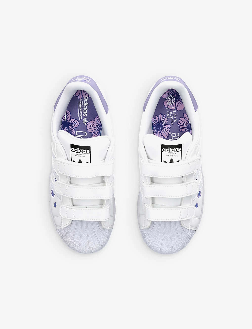 - Round shell toe, contrasting three stripes at side, branded print at tongue, floral details, contrasting panel at rear with branding