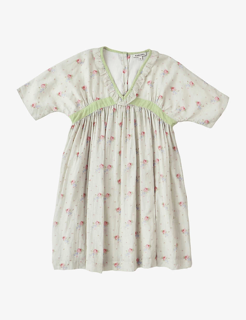 - V-neck, frill neckline, short sleeves, all-over rose bouquet print, contrasting ribbon at neckline and waist