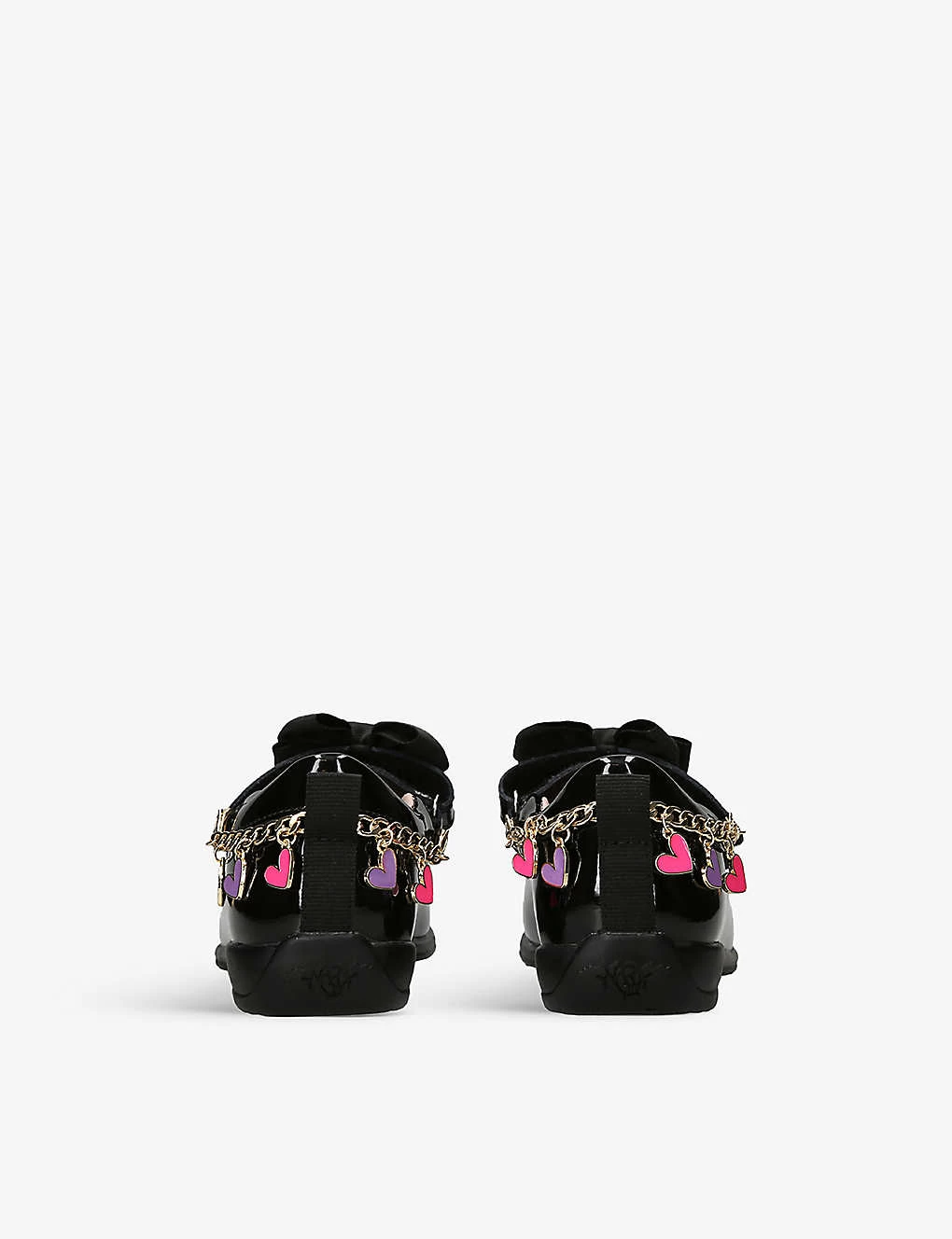 - Round toe, tonal stitching, bow on strap, embroidered brand logo at strap, detachable hear-embellished chain bracelet on heel