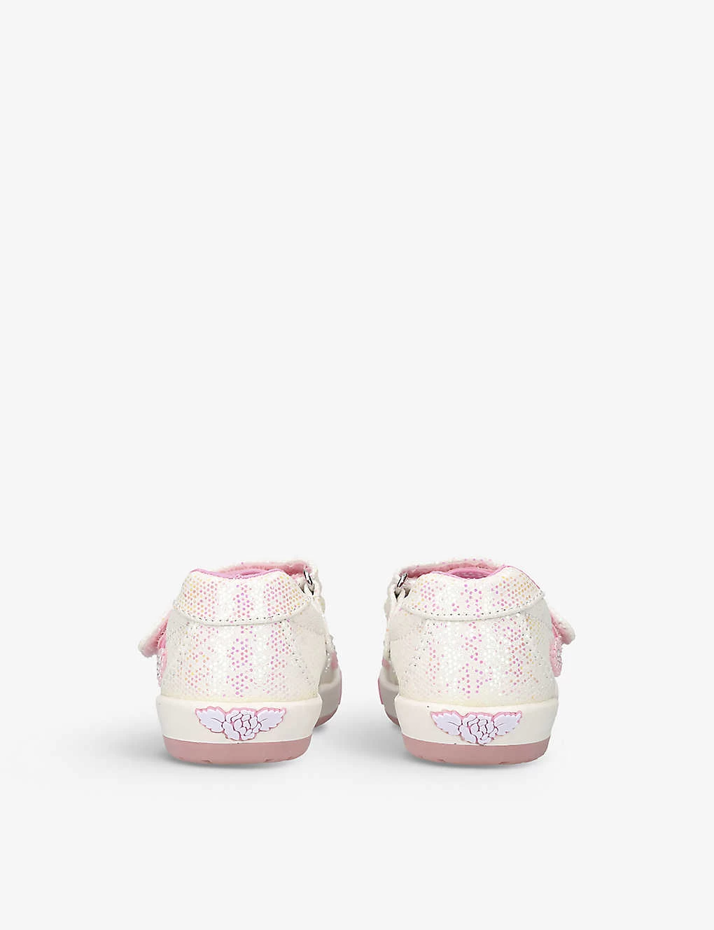 - Round closed toe, heart beading at upper, embroidered-branded front strap, embossed branding at sole