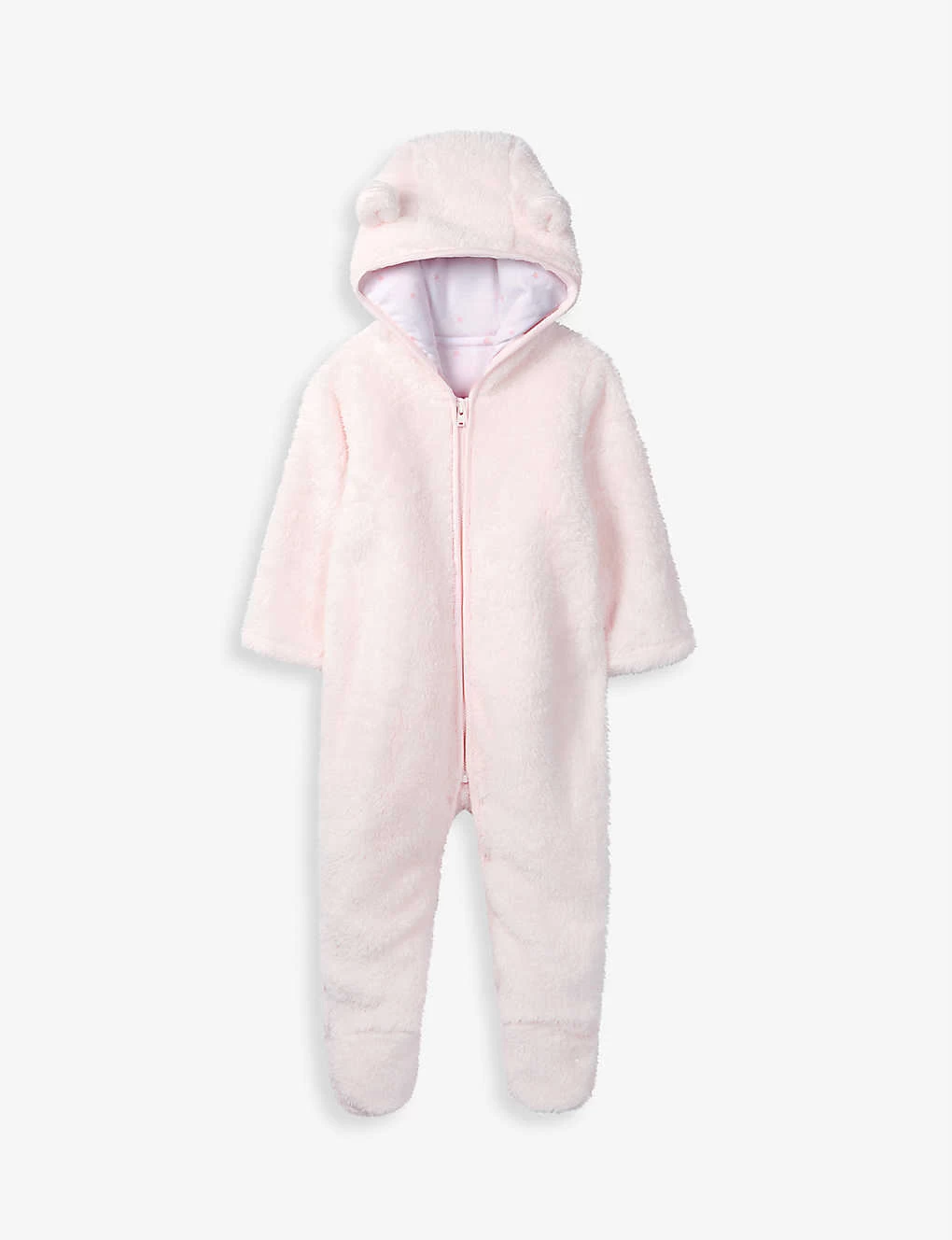 - Hooded, 3D bear ear detail at hood, printed lining, reinforced feet