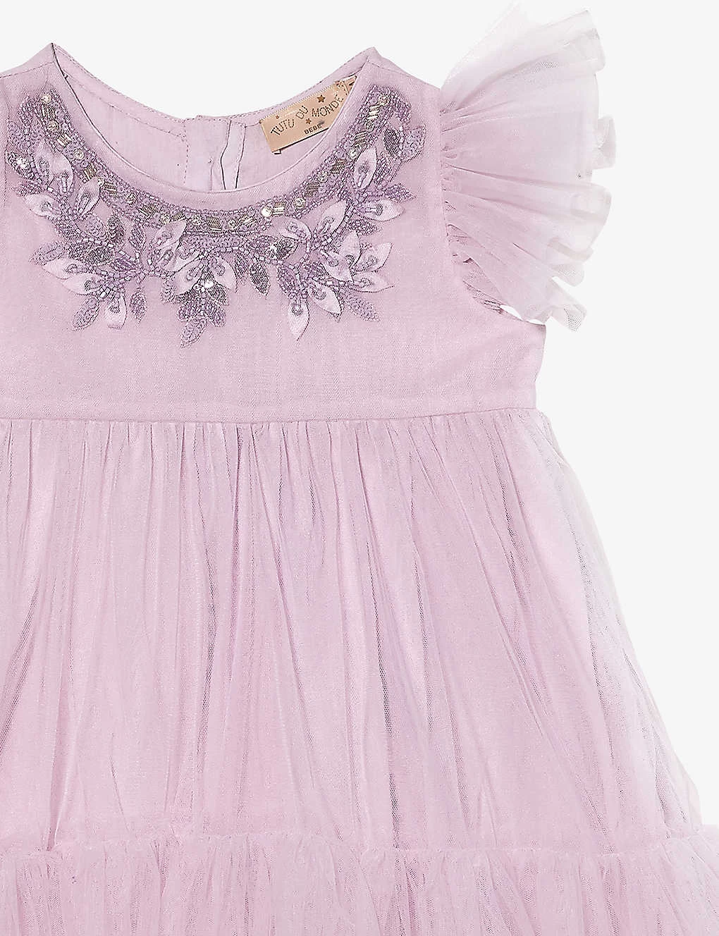 - Round neck, bead and sequin embellishment at the neck, ruffle sleeves, tulle skirt, lined