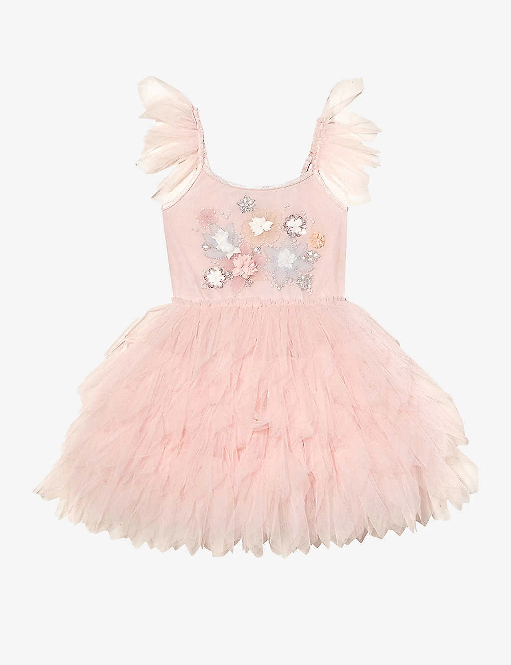 - Round neckline, narrow straps, ruffle-trim at the straps, all-over embroidery at the bodice, tulle skirt, lined