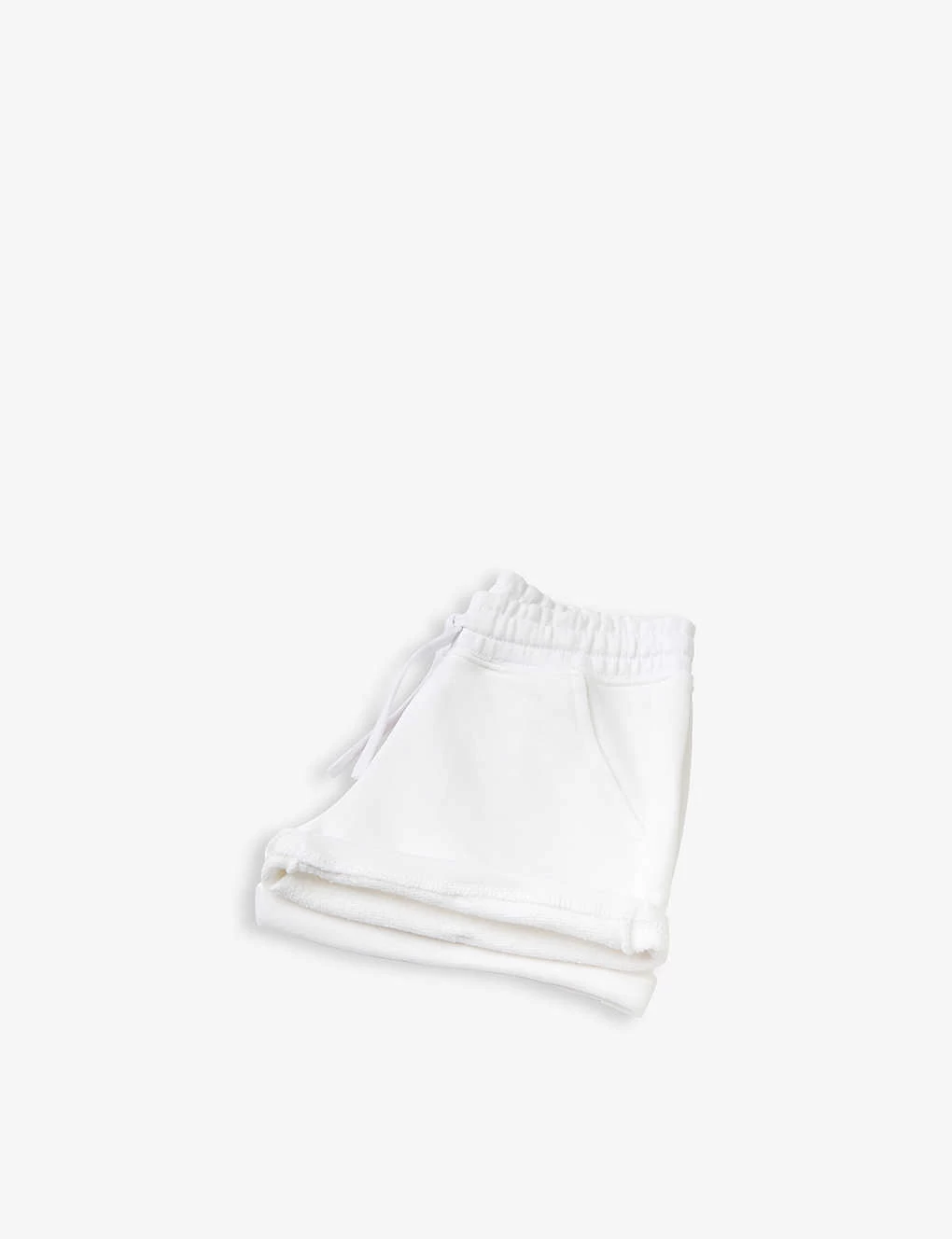 - Elasticated drawstring waistband, tonal logo embroidery at side, two side slip pockets, turned-up hem