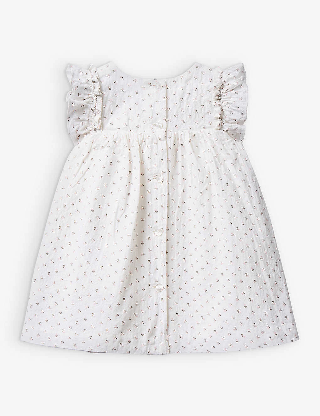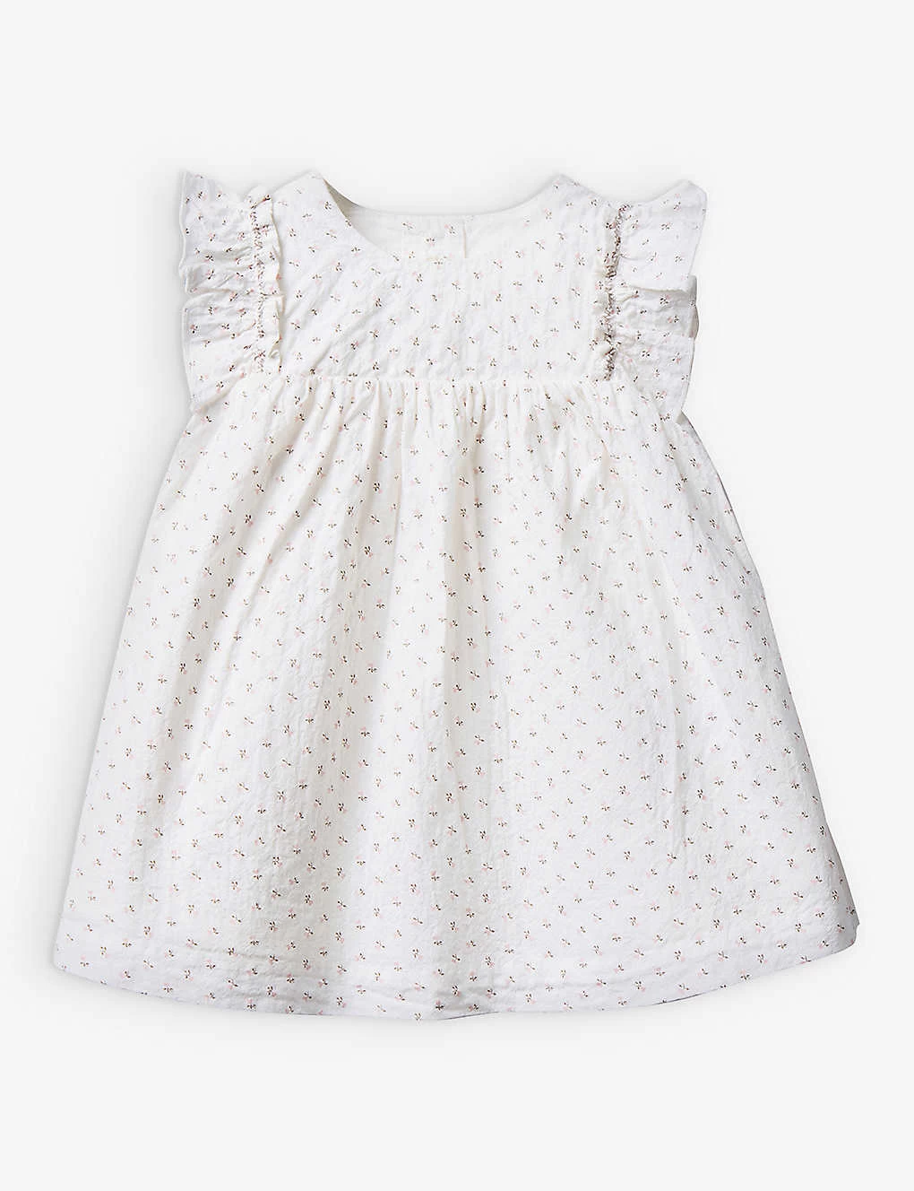 - Round neck, ruffled cap sleeves, gathered skirt, all-over microprint