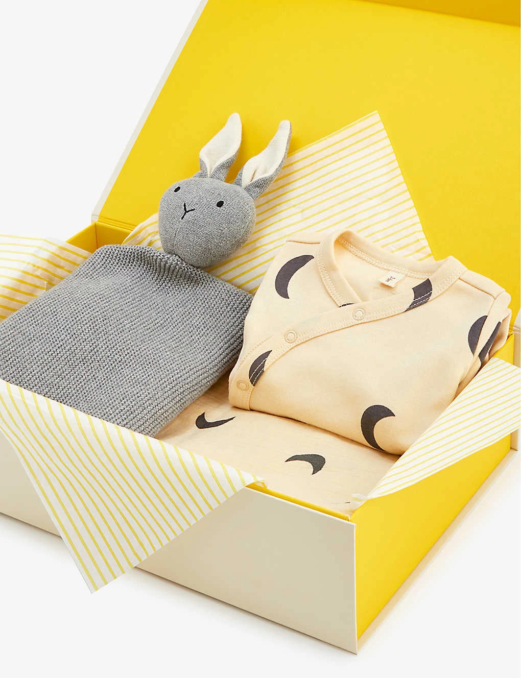 Includes: Organic Zoo Moon organic-cotton bodysuit, Organic Zoo Moon organic-cotton muslin 65cm x 65cm, Liewood Milo rabbit cuddle cloth 40cm x 40cm, gift set