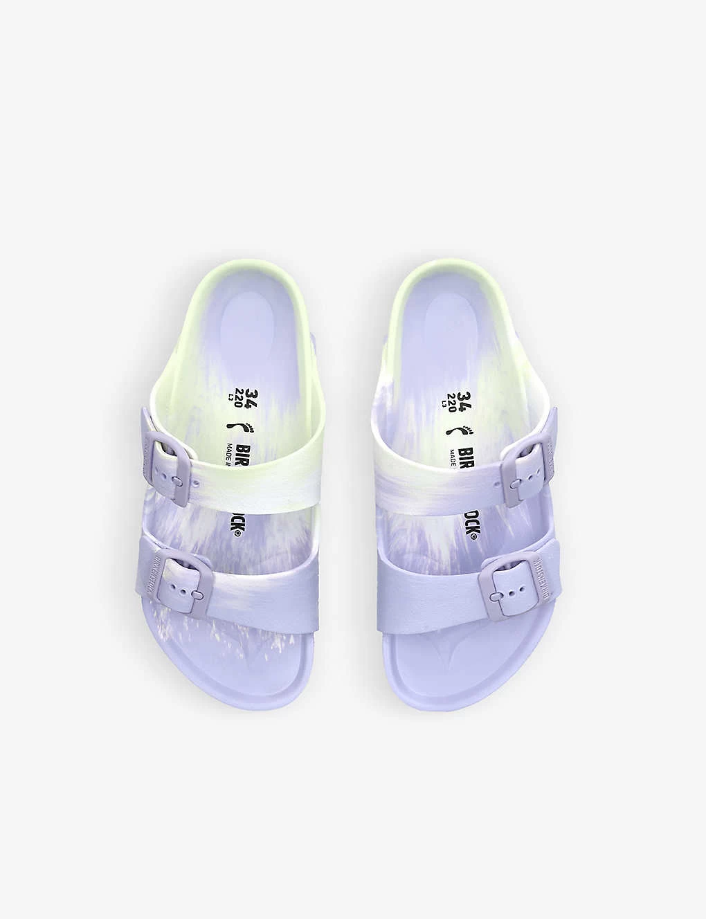 - Round open toe, two adjustable buckle straps, graphic-print throughout, signature contoured footbed