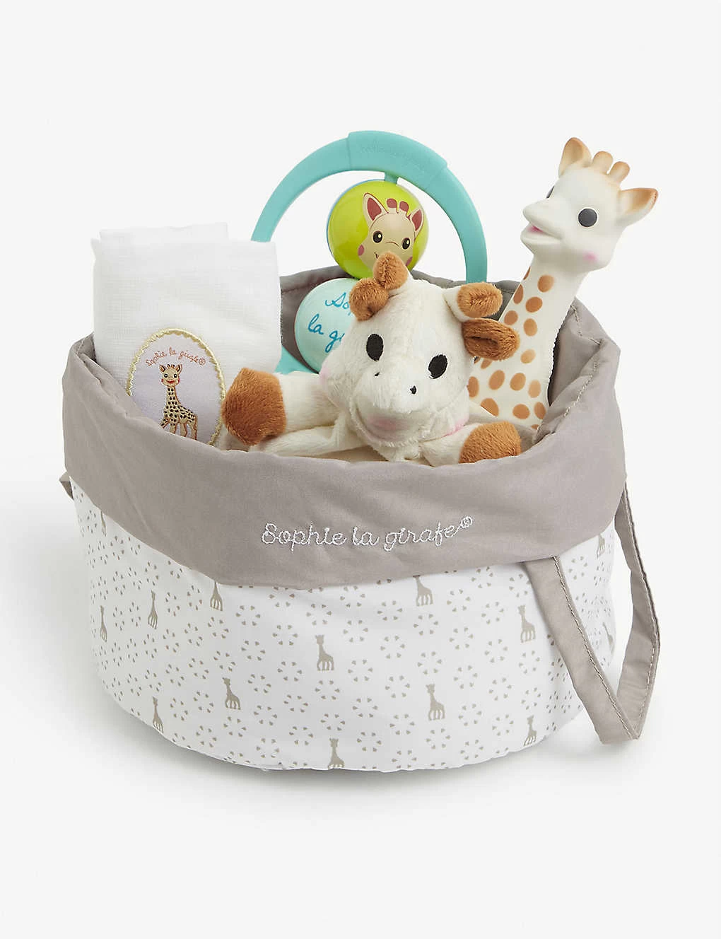 - Basket with handles and giraffe print, includes signature giraffe teether, muslin with embroidered giraffe patch, rattle toy, comforter with giraffe plush at centre