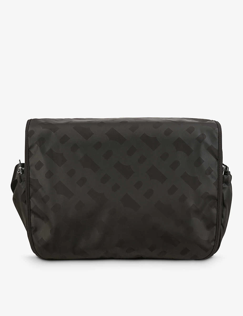 - Detachable and adjustable shoulder straps, detachable buggy straps, all-over monogram pattern, branded patch at front, exterior side pockets, front flap, integrated changing mat, zip-fastened main compartment, interior elasticated pockets