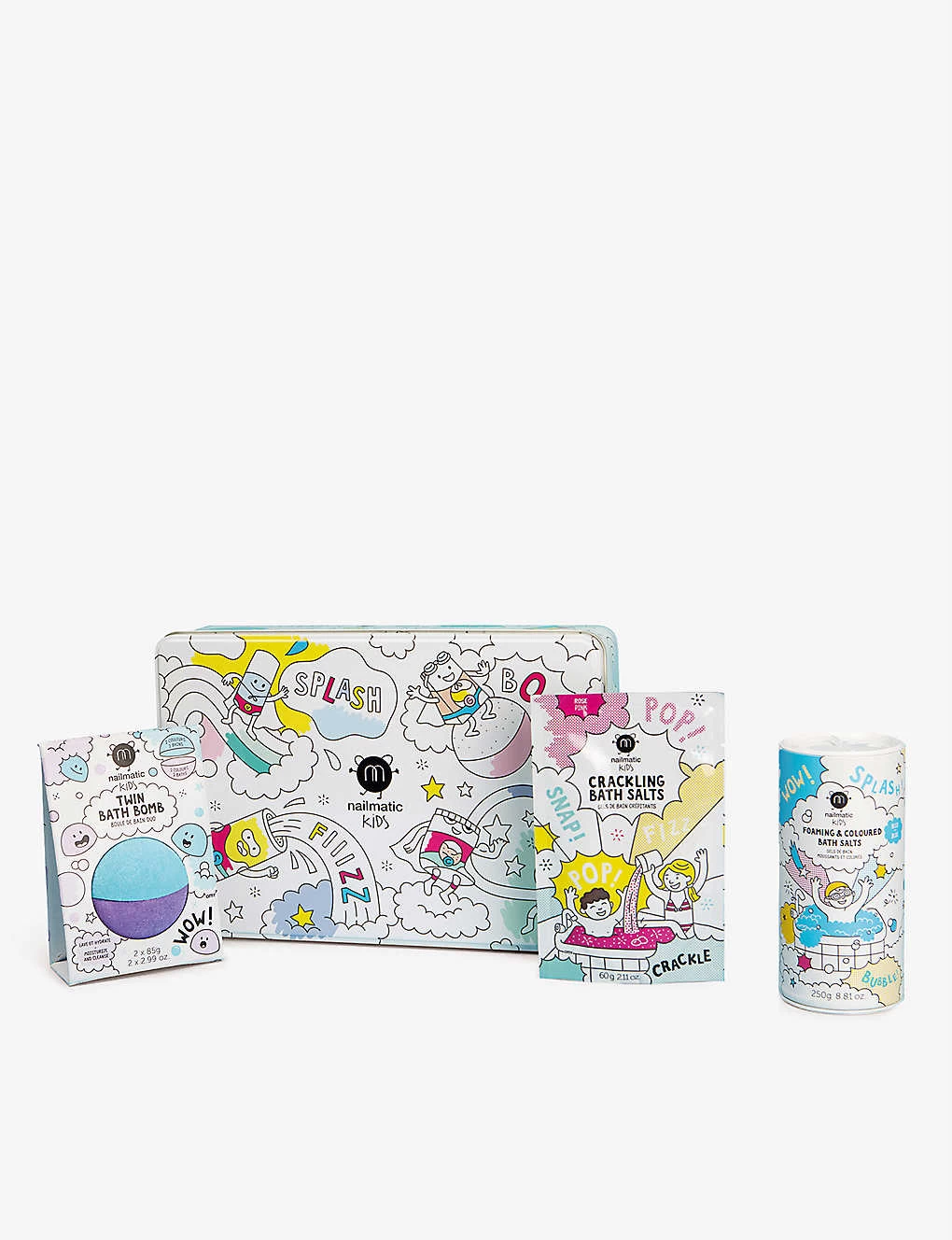 - Includes: 1 duo bathbomb (blue and violet) 160g, 1 blue foaming & coloured bath salts 250g, 1 pink crackling bath salts 60g