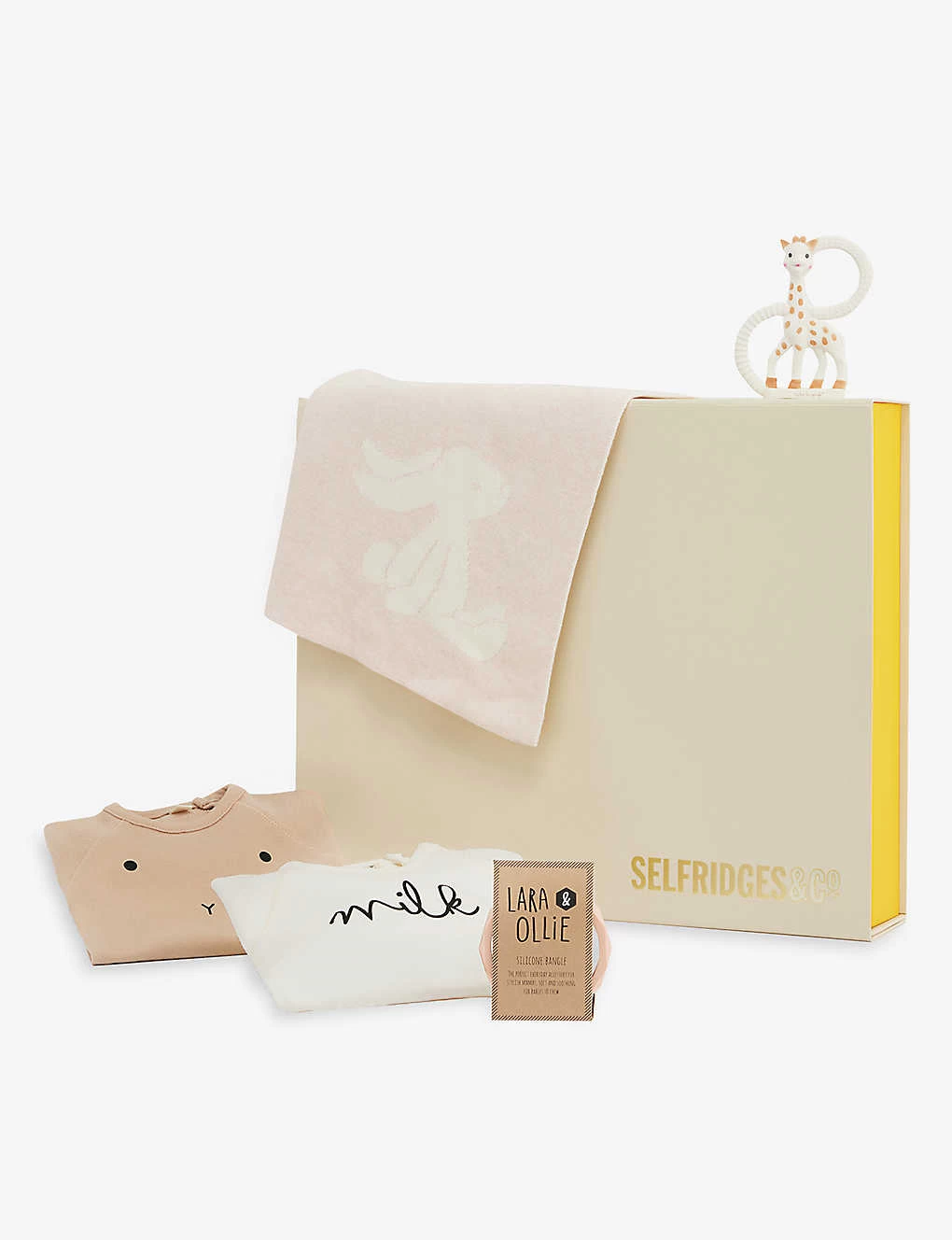 Fancy putting together your own unique hamper? Please call 0207 318 3458 or email [email protected] to speak with our in-house service team to place a bespoke orderSelfridges Selection Bunny medium baby hamper 0-3 months – 5 items includedIncludes: Jelly Cat Bashful Bunny cotton blanket 102cm x 76cm, Organic Zoo Milk organic-cotton bodysuit 0-3 months, Organic Zoo Sleepy Face organic-cotton bodysuit 0-3 months, Sophie the Giraffe baby teething toy, Lara & Ollie teething bangle medium gift boxJelly Cat Bashful Bunny cotton blanket 102cm x 76cm100% cottonReversible, bunny print, wrapped in ribbonHeight 102cm, width 76cmMachine wash coldOrganic Zoo Milk organic-cotton bodysuit 0-3 months100% organic cottonPress stud fasteningLong sleeves, round neck, milk printMachine wash coldOrganic Zoo Bunny organic-cotton bodysuit 0-3 months100% organic cottonPress stud fasteningLong sleeves, round neck, bunny face printMachine wash coldSophie The Giraffe rubber chew and giraffe set100% natural rubber with food-grade paintsWipe clean