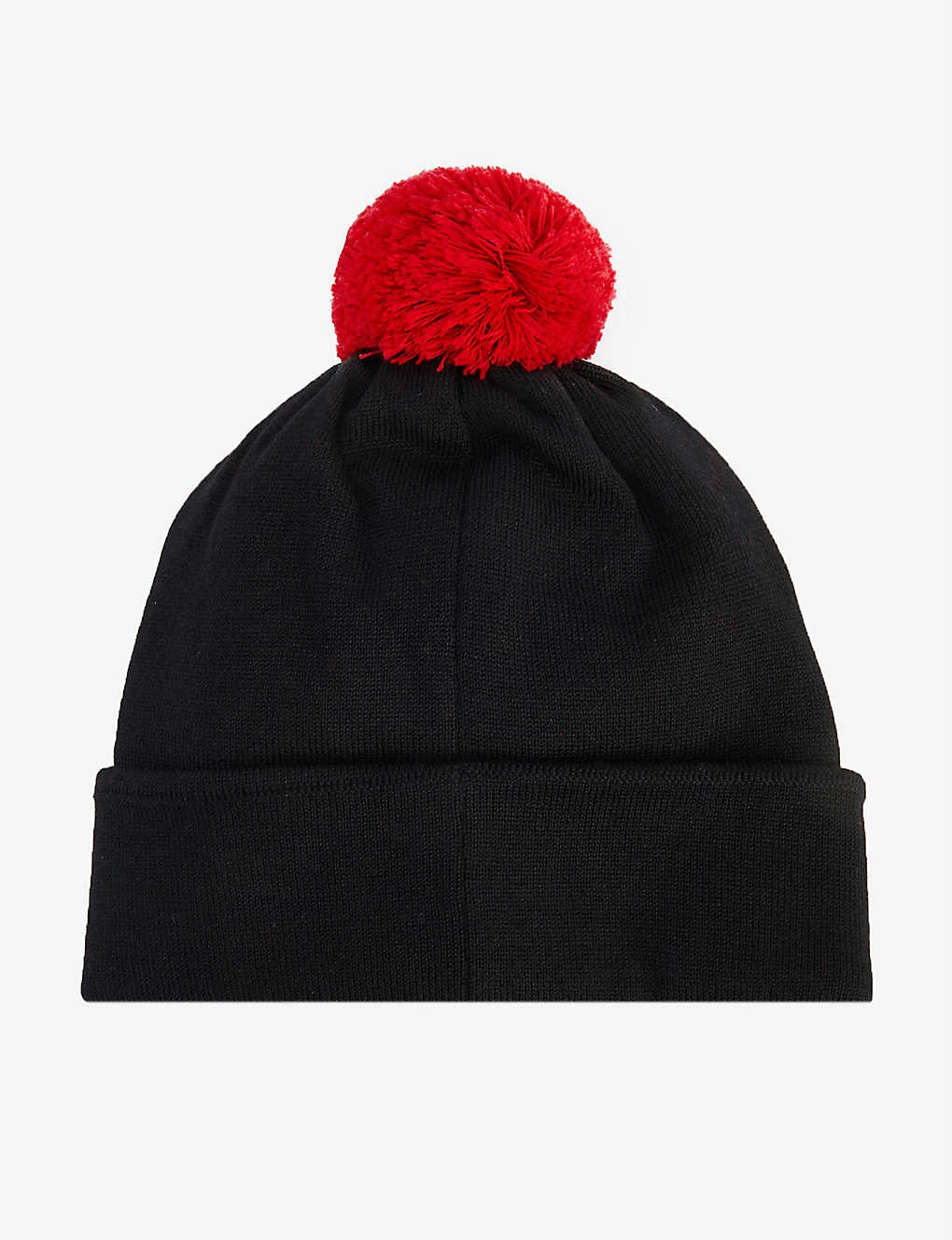 - Wide brim, brand patch at front, pom-pom embellishment at top, all over ribbed and knitted, internal brand tab, fully lined