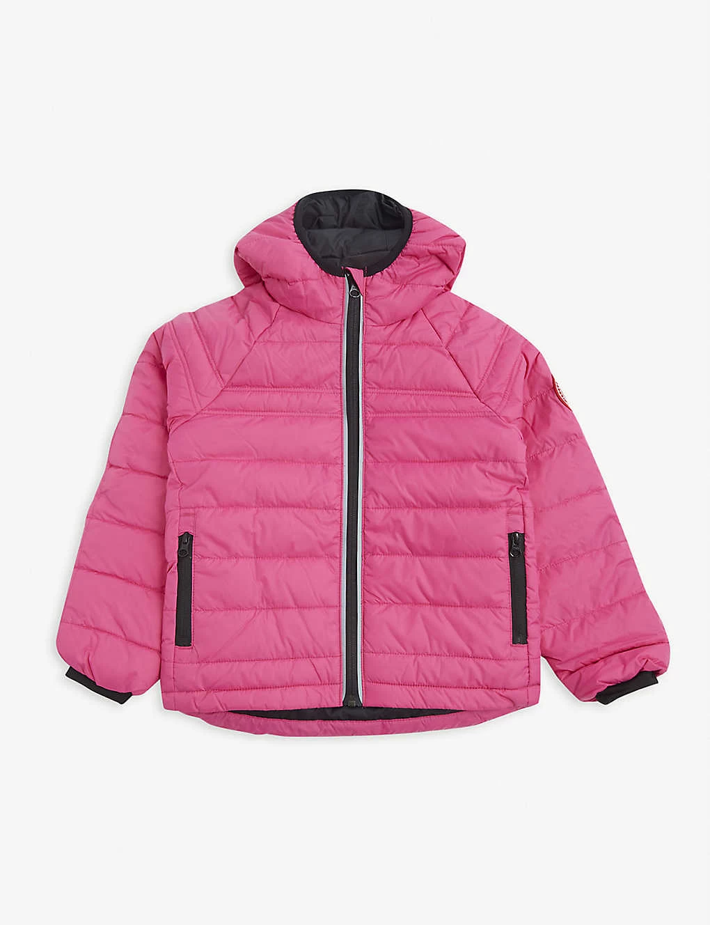 - Elasticated hood, long sleeves, twin zip pockets, all-over quilted, reflective panel at zip, embroidered logo at sleeve