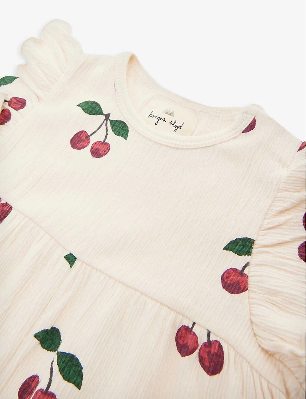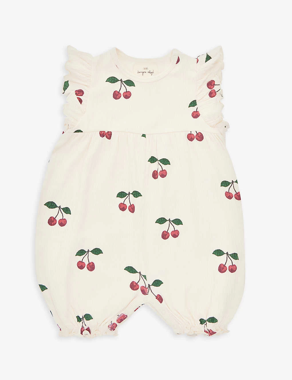- Round neckline, sleeveless, ruffle trims, cherry pattern, soft crease texture, elasticated hems