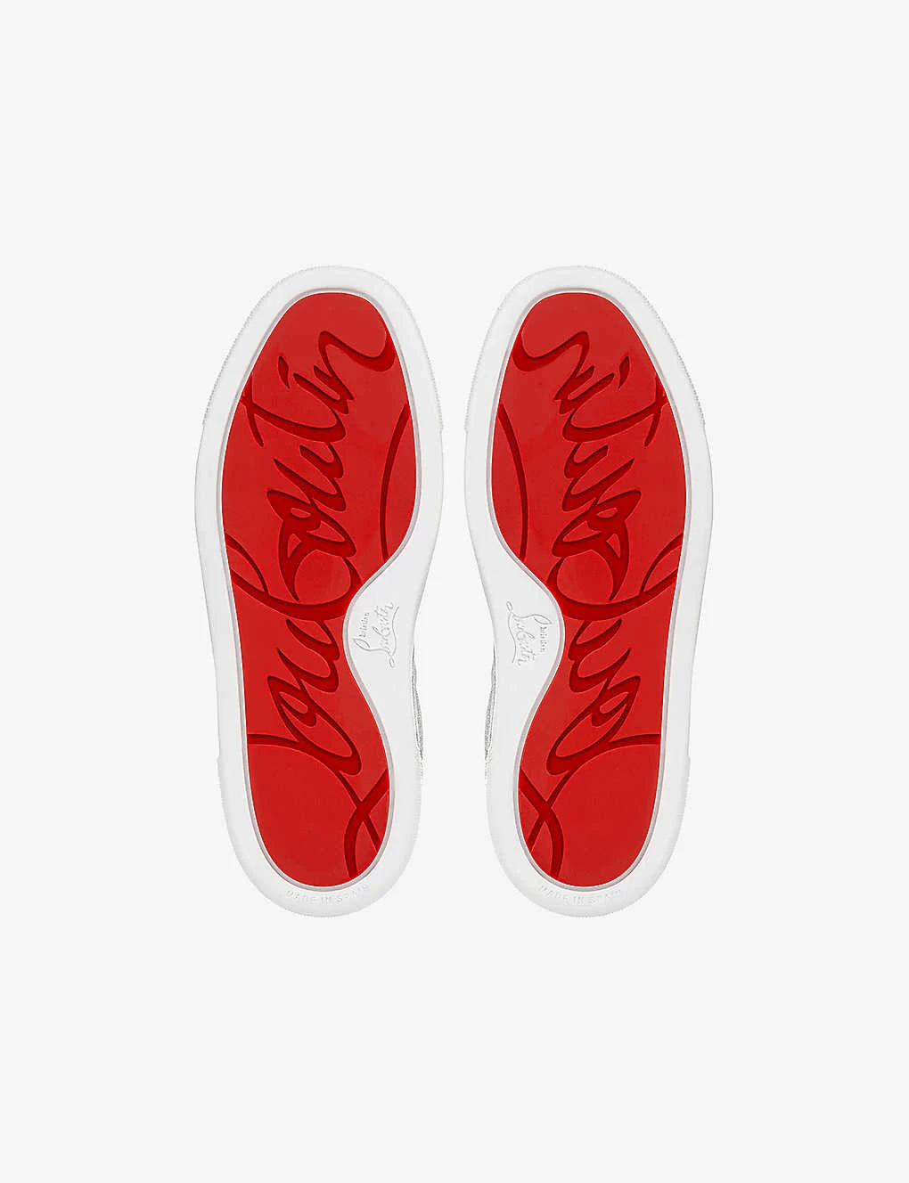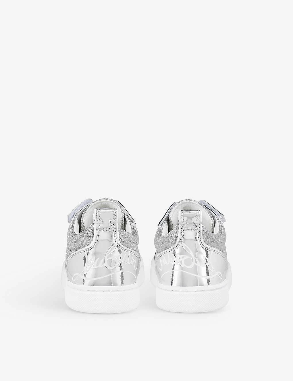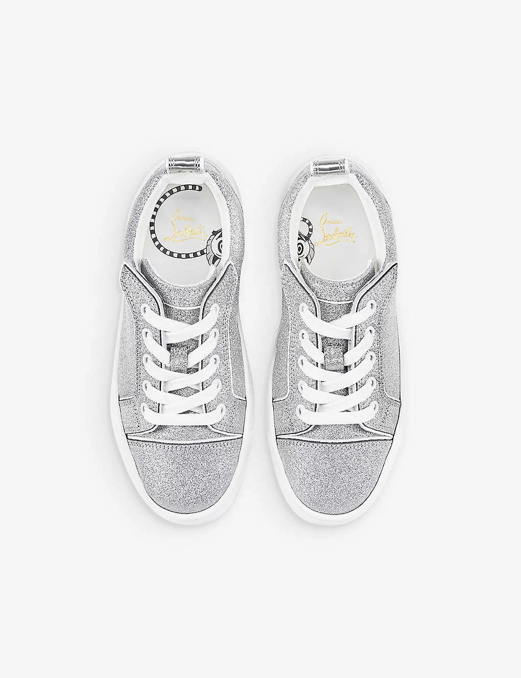 - Low top, round toe, all-over glitter, panelled design, metallic patent-leather heel and pull tab, signature red sole