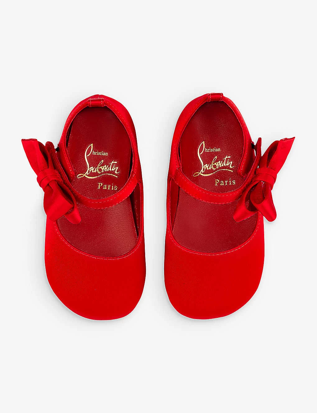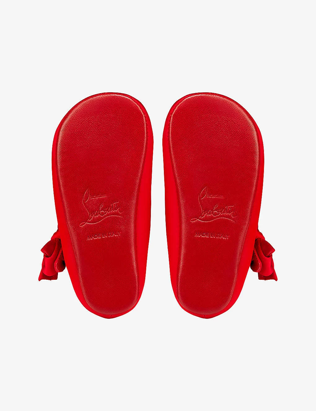 - Closed round toe, elasticated front strap, bow at strap, pull tab at heel, signature red sole