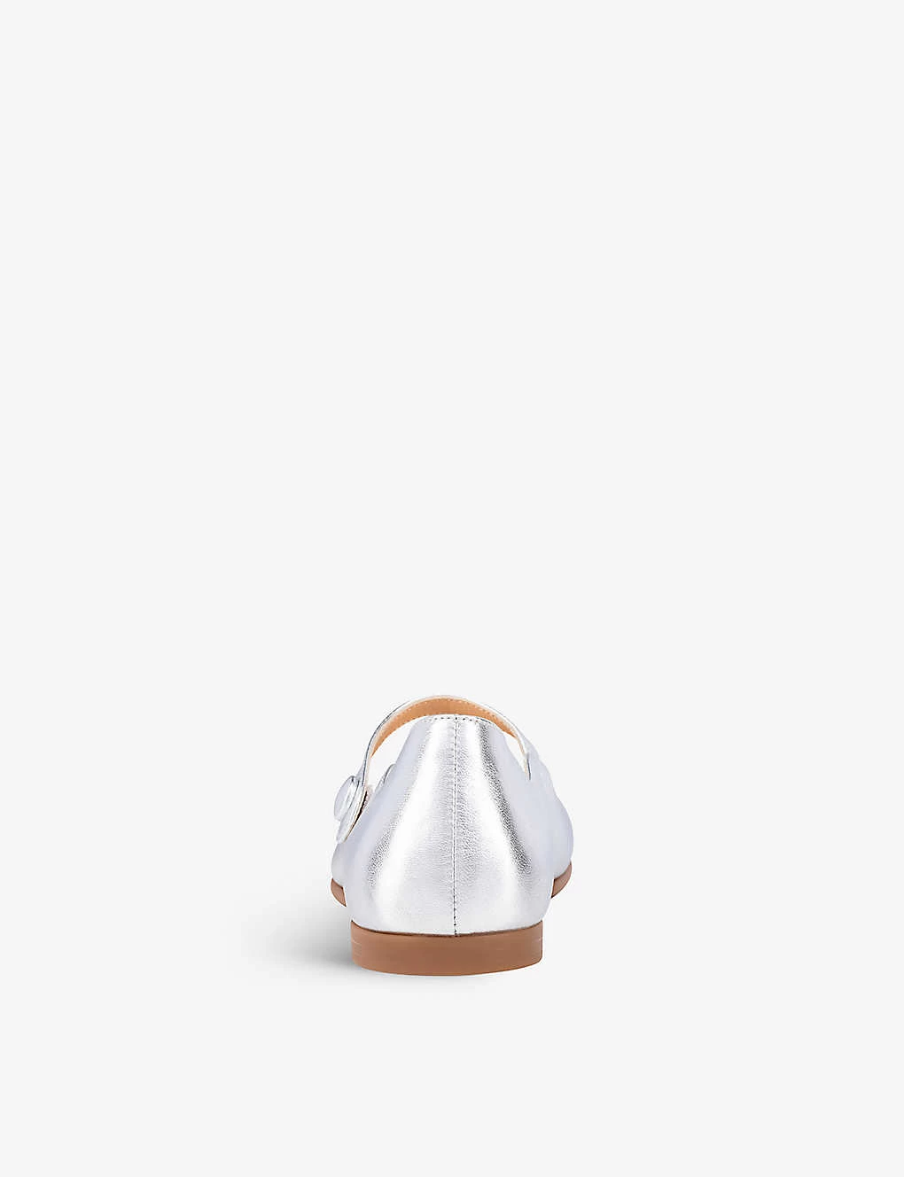 - Round toe, flat sole, one single strap at the front, metallic finish