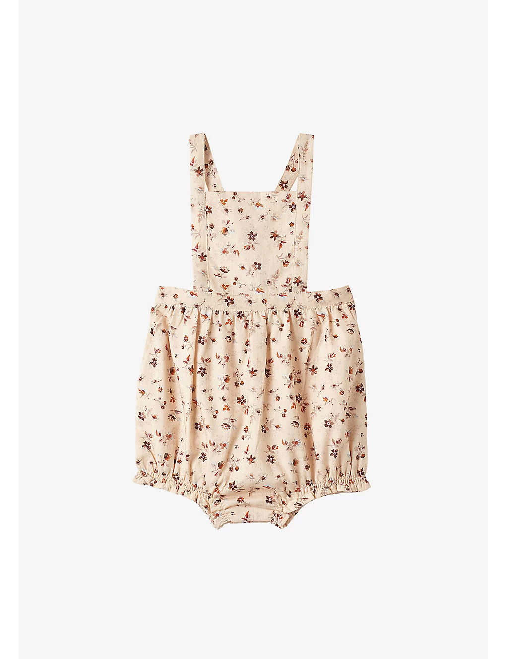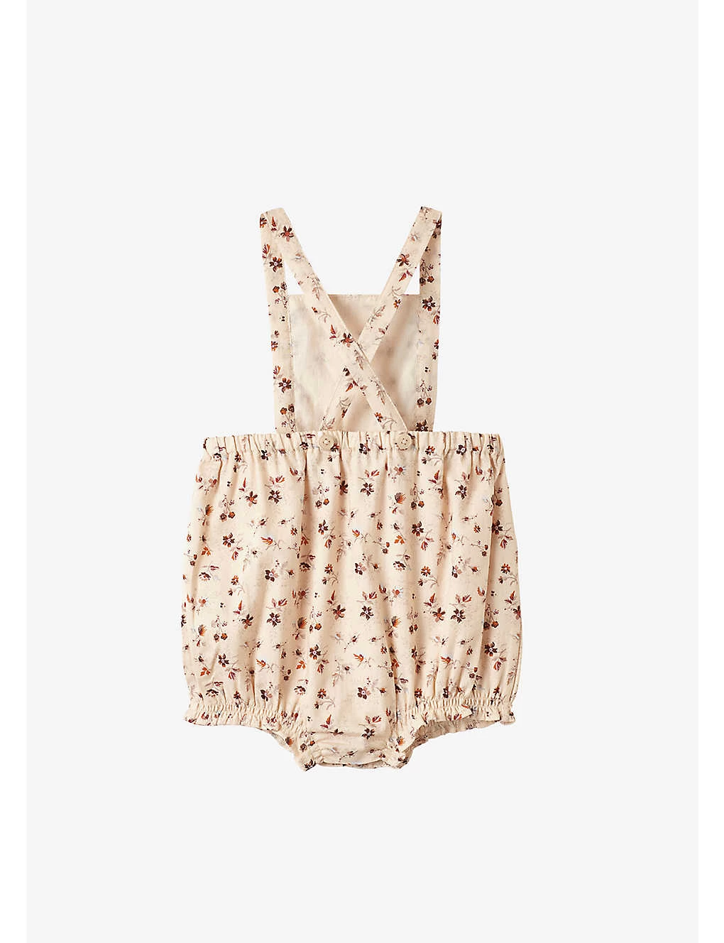 - Bib front, two cross-over straps with adjustable button fastening, all-over floral print, elasticated waistband, elasticated leg hems