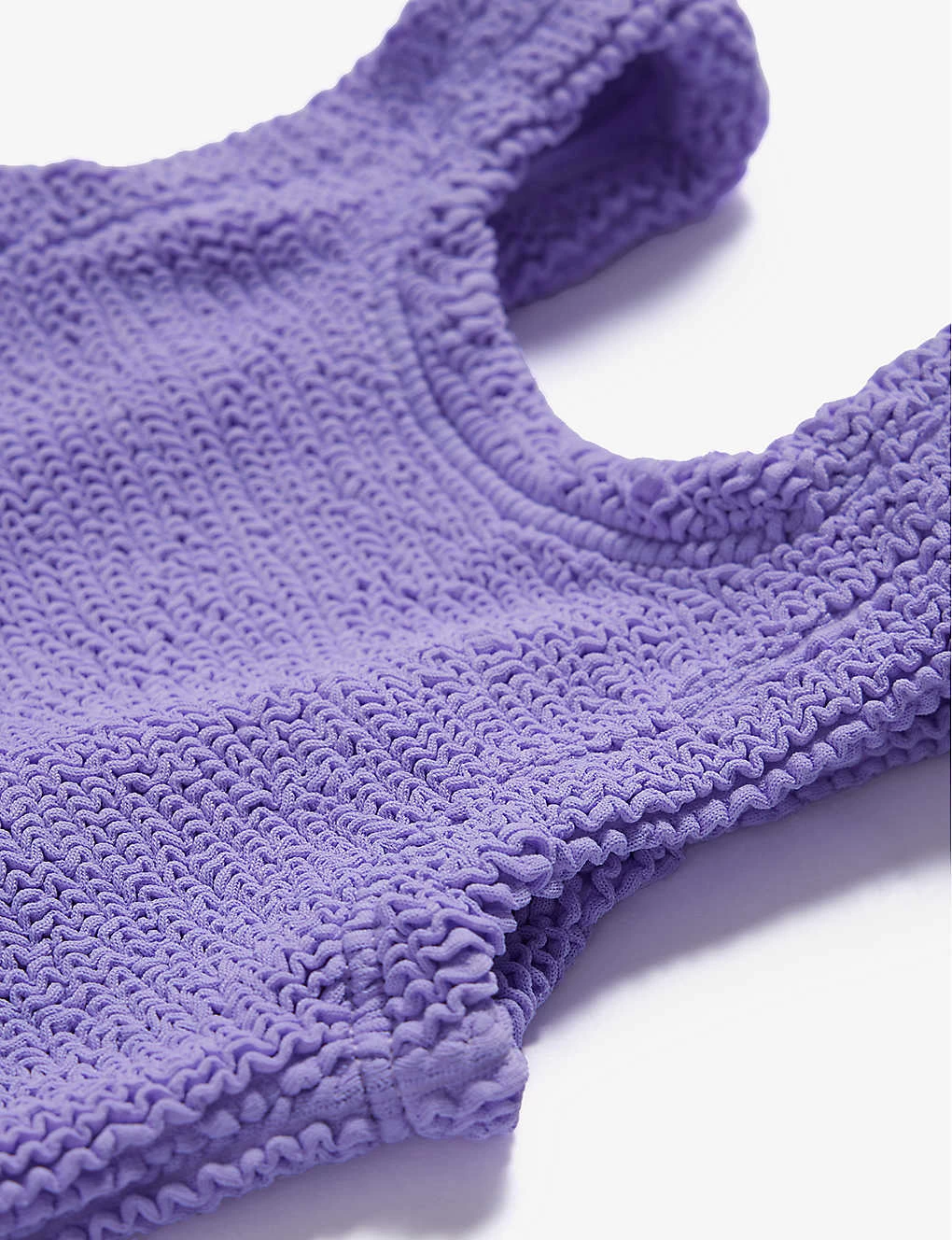 - Scoop neck, shoulder straps, open at back, all-over crinkle texture, lined gusset