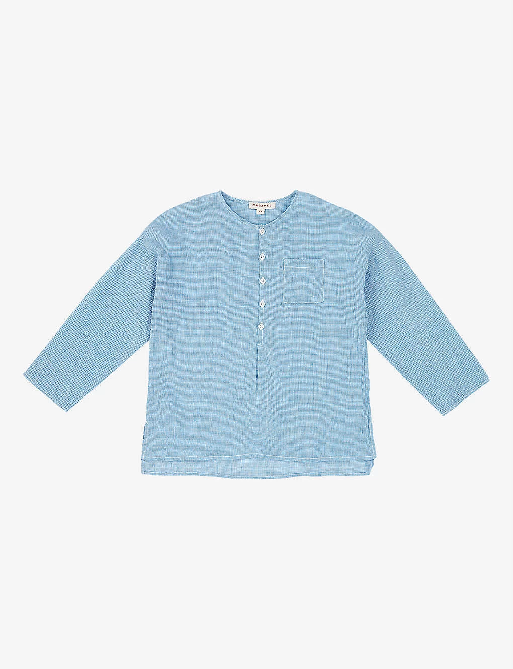 - Long sleeves, micro-check, button detailing, patch pocket, collarless