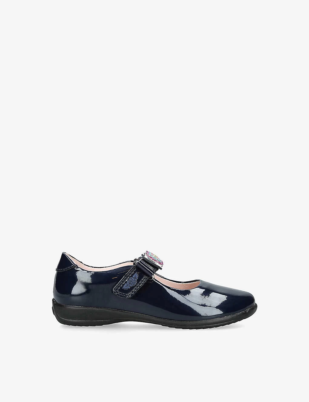 - Round closed toe, patent finish, adjustable Mary Jane hook-and-loop tape strap at front, crystal-set bow embellishment at strap, logo embossing at heel