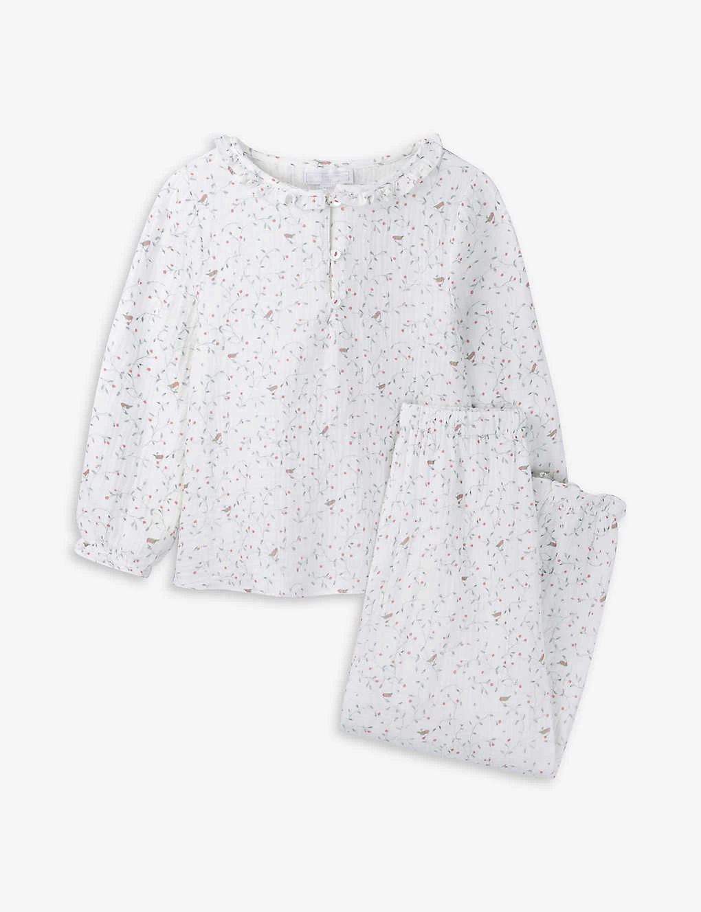 - Top: exposed button fastenings, frilled neckline, long sleeves, elasticated cuffs, all-over floral robin print