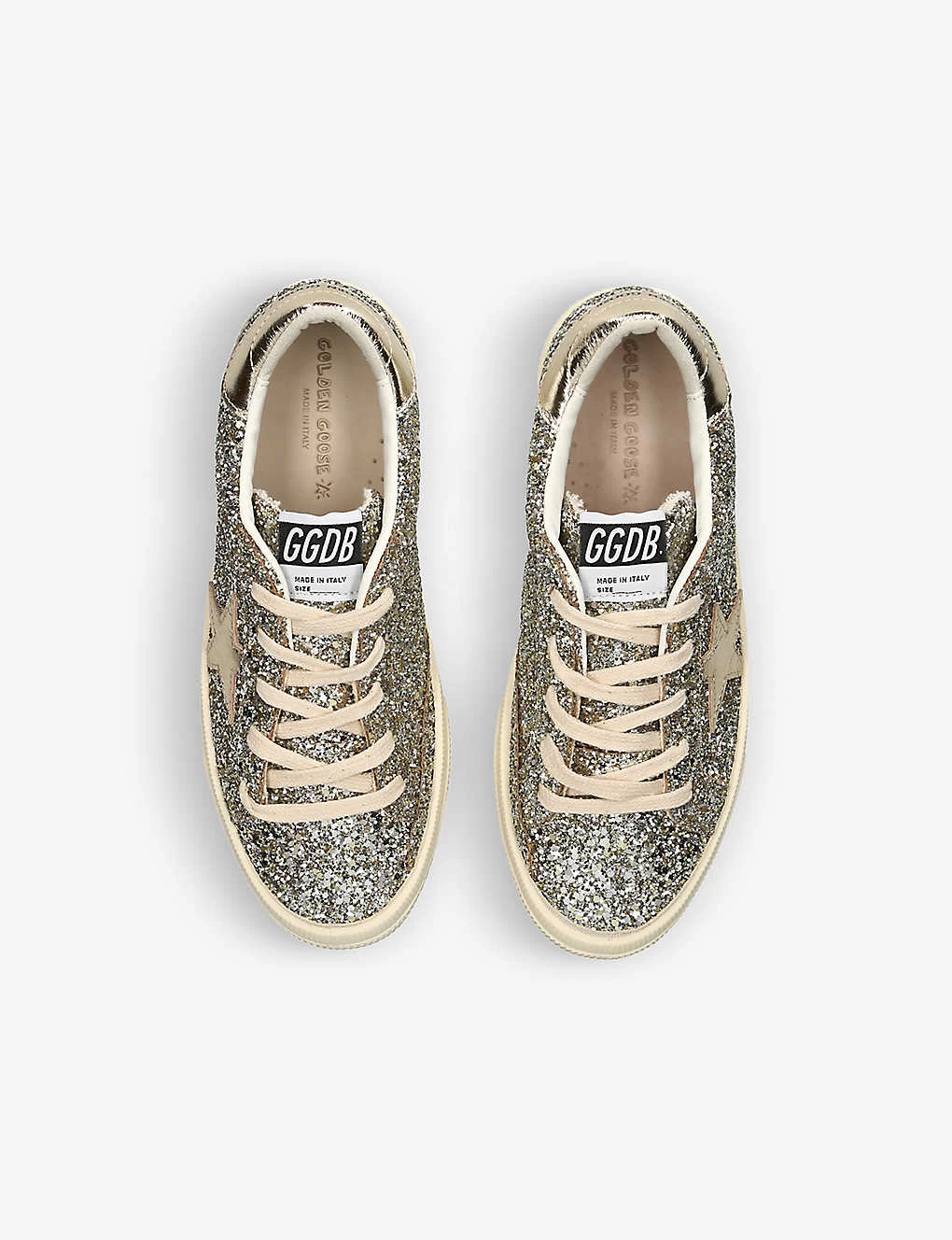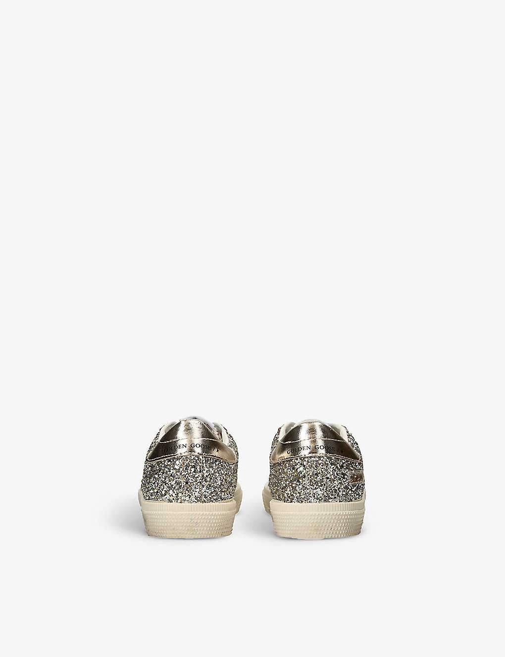 - Round closed toe, contrast panel at back heel, branded logo on tongue and sides, embellished star-motif at sides, low-top silhouette, glitter throughout