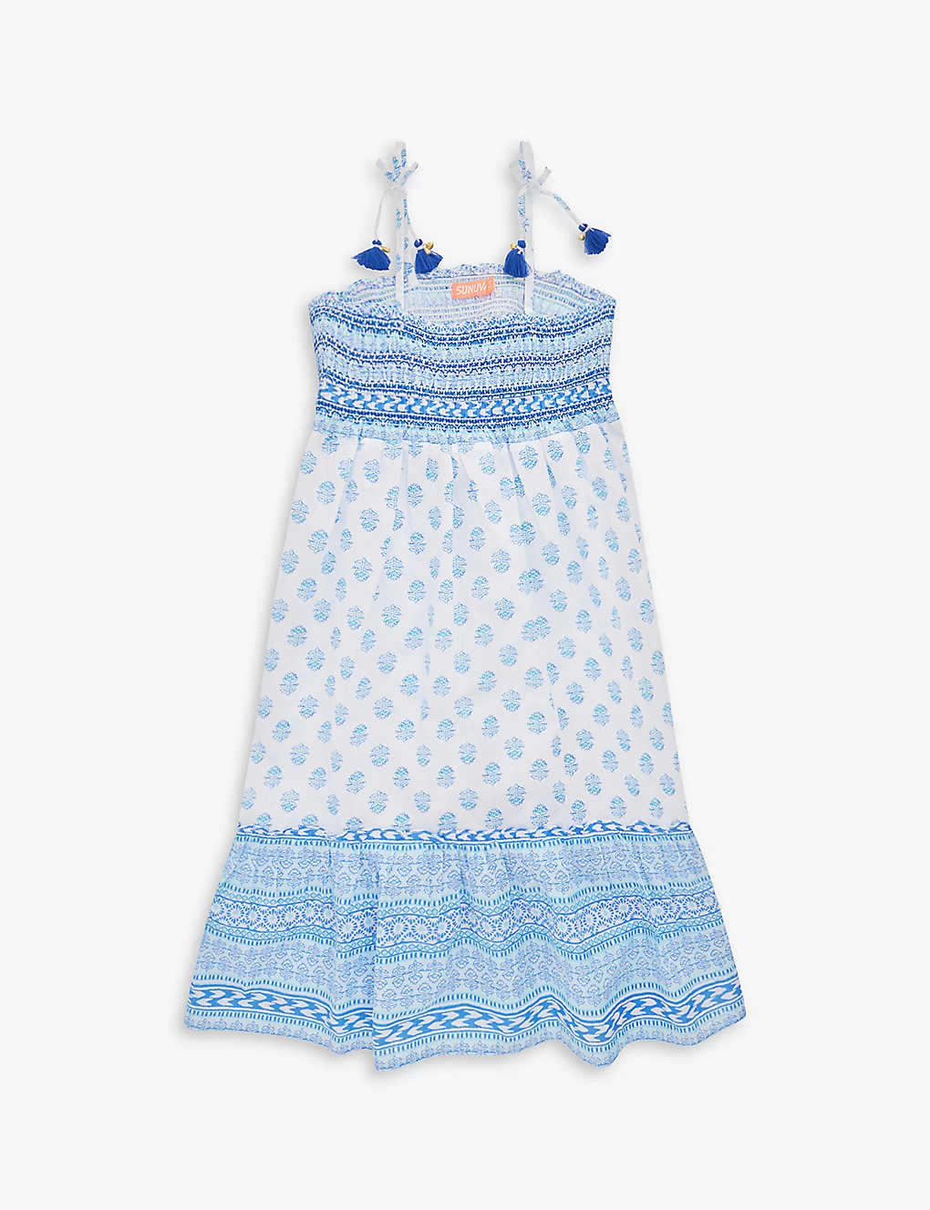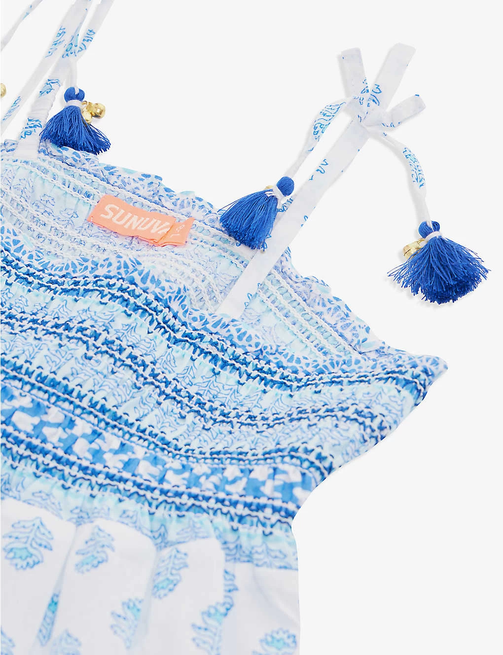 - Regular fit, shoulder straps, shirred at top, all-over print, tiered hem, tassel trims