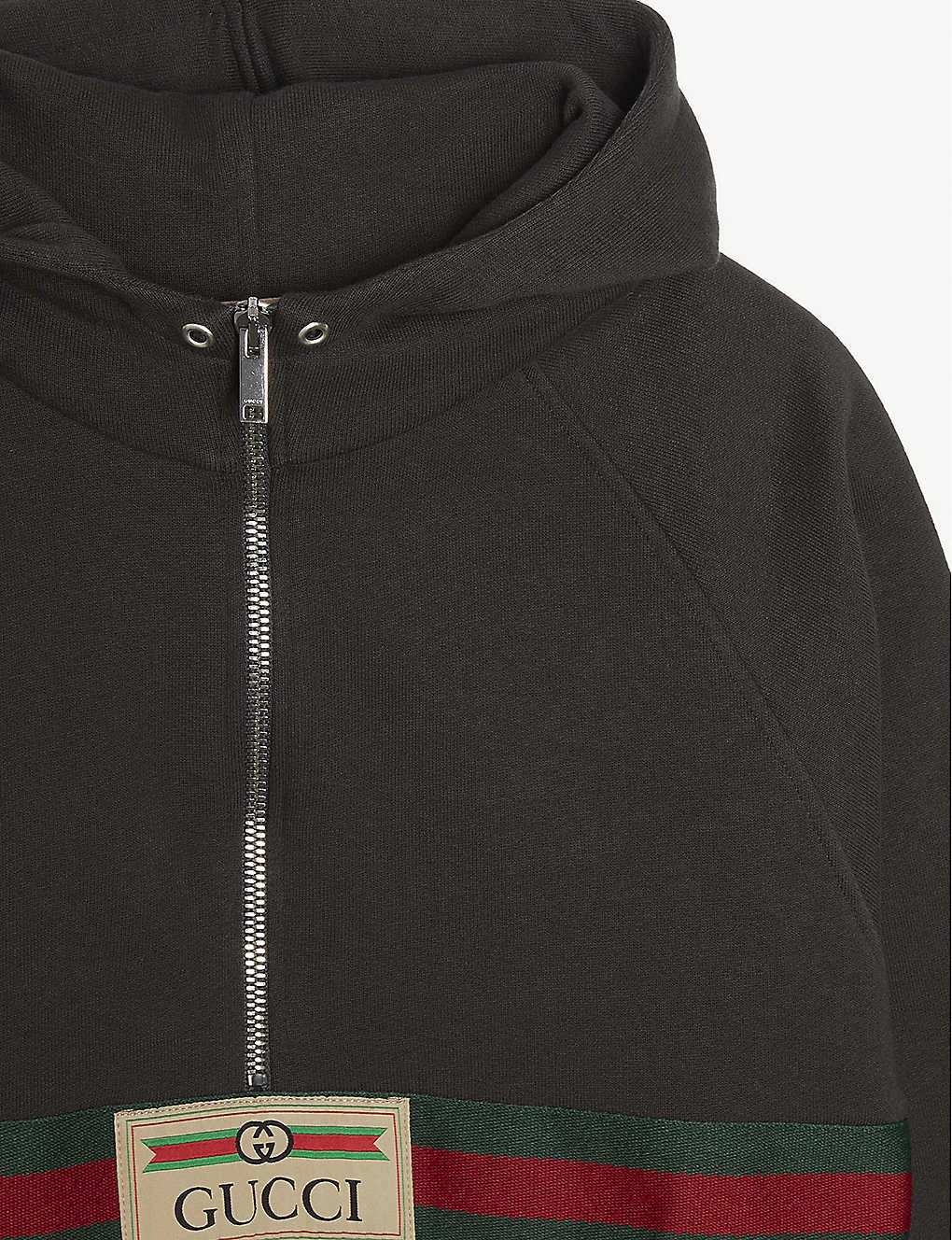 - Hood with drawstring eyelets, half-zip, long sleeves with ribbed cuffs, kangaroo pocket, signature web stripe detail, logo label at front