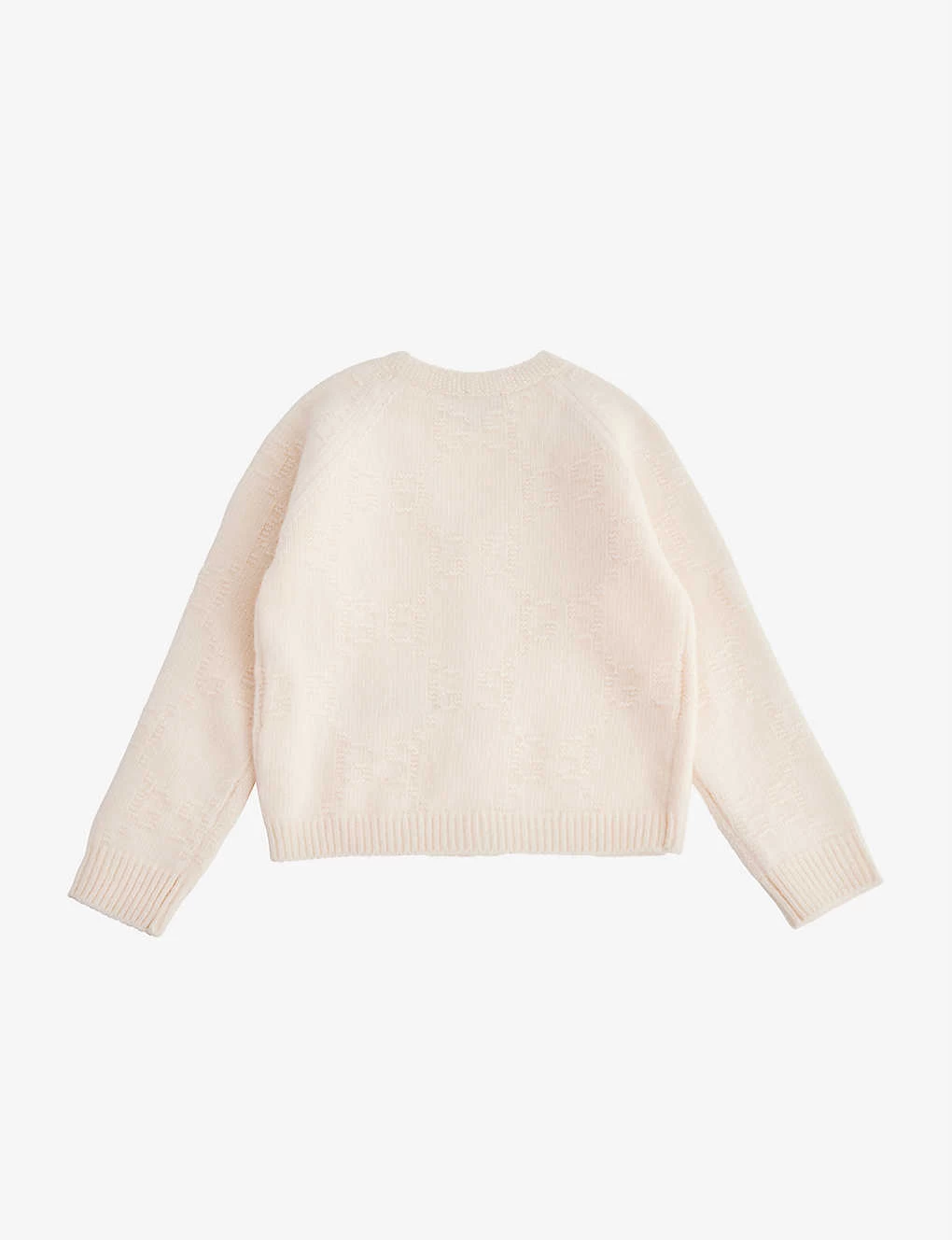- Relaxed fit, V neck, raglan long sleeves, ribbed elasticated cuffs, all over monogram embroidery, all over knitted, ribbed elasticated hem