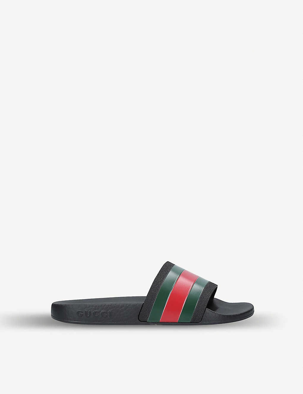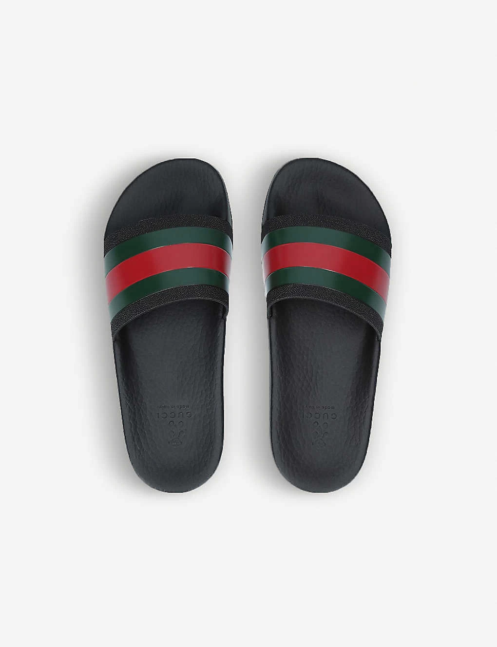 Gucci rubber sliders Slip-on Open toe, brand webbing across front strap, moulded rubber footbed Rubber upper, lining and sole Heel height 0.9″” Made in Italy Sizing: Sizes 0-2 (kids): 0-6 months, Sizes 3-4.5 (kids): 6 months-1 year, Sizes 5-6 (kids): 2-3 years, Sizes 7-8 (kids): 3-4 years, Sizes 8.5-9 (kids): 4-5 years, Sizes 10-12.5 (kids): 6-7 years, Sizes 13 (kids)-1 (adult): 7-8 years, Sizes 2-2.5 (adults): 8-9 years, Sizes 3-5 (adults): 9-10 years, Sizes 6-6.5 (adults): 10-12 years
