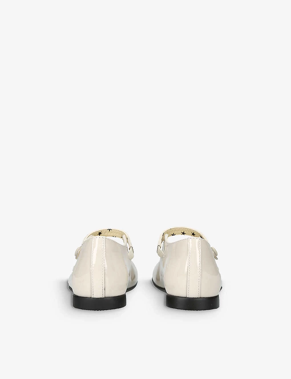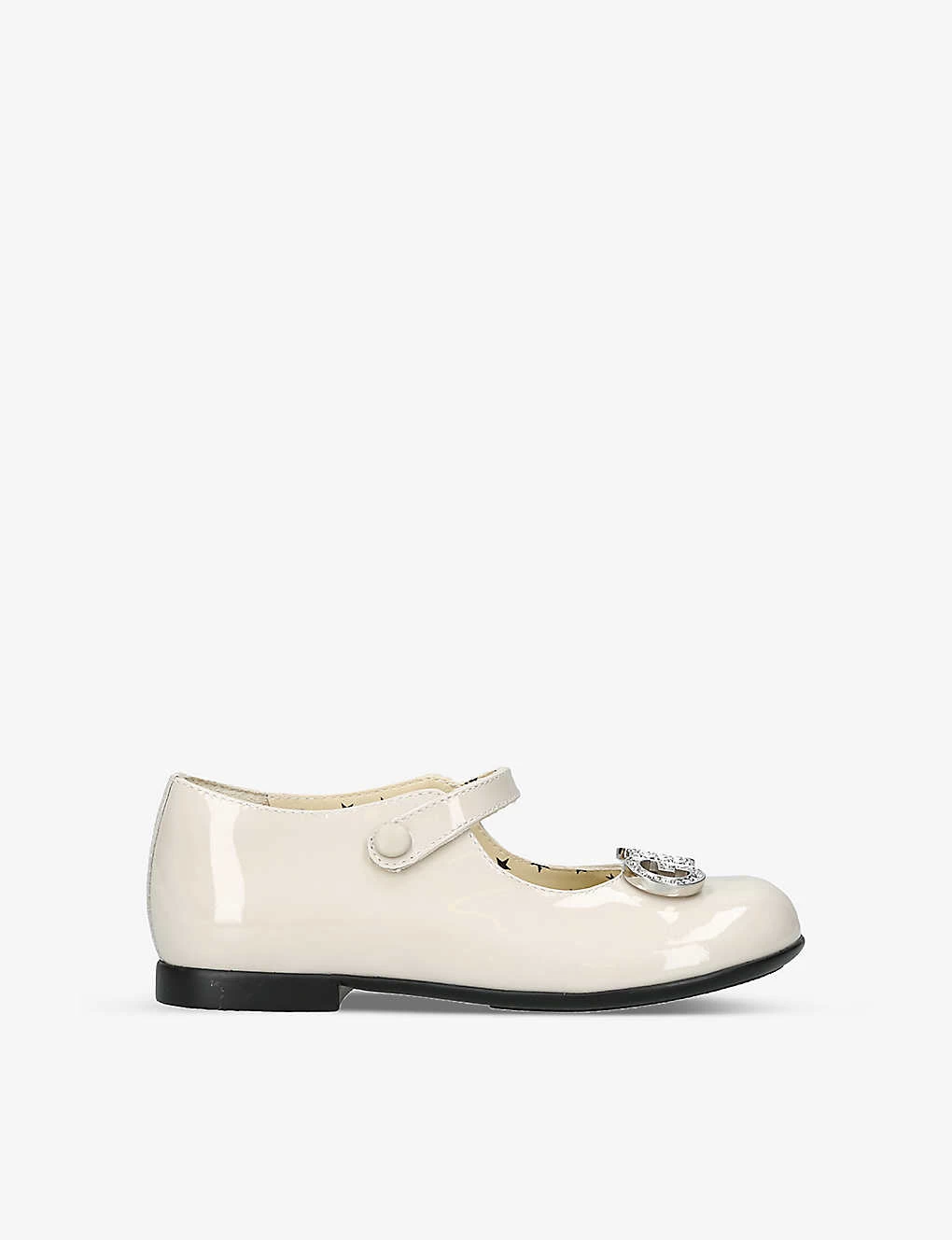 - Round closed toe, single thin buckle strap at front, crystal-embellished logo placket at front, all-over patent finish