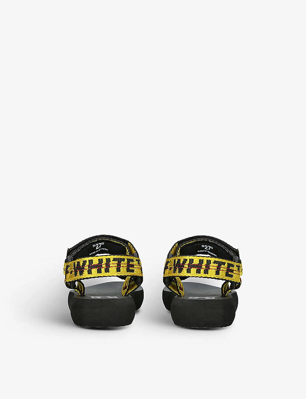 - Open round toe, adjustable ankle strap, all-over branded industrial logo straps, printed logo on footbed, gunmetal-tone hardware