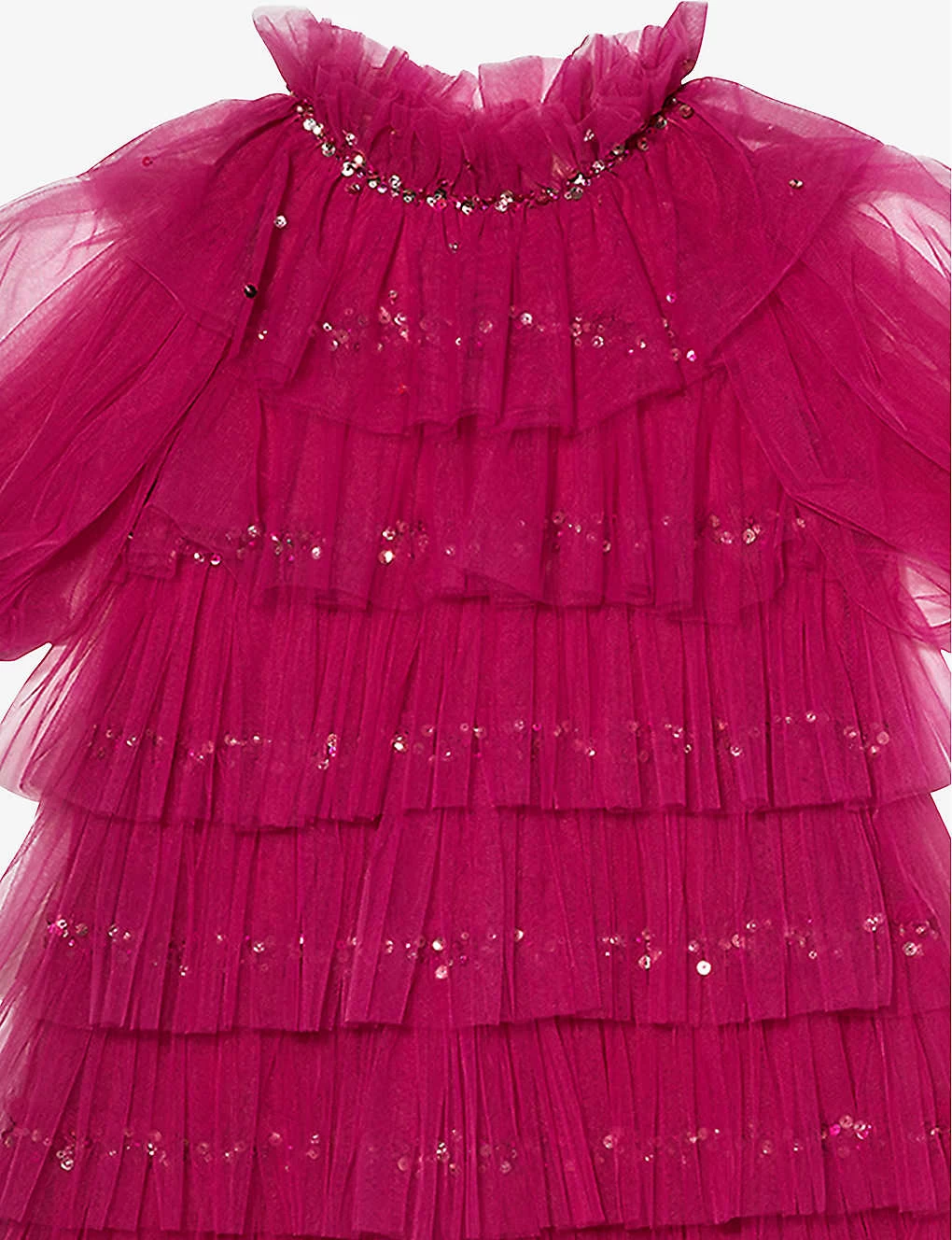- High neckline, sequin-embellishment at the neck, short sleeves, sheer sleeves, all-over tiered design, sequin embellishment