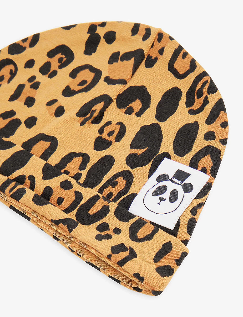 - Folded brim, brand patch at front, all over leopard print