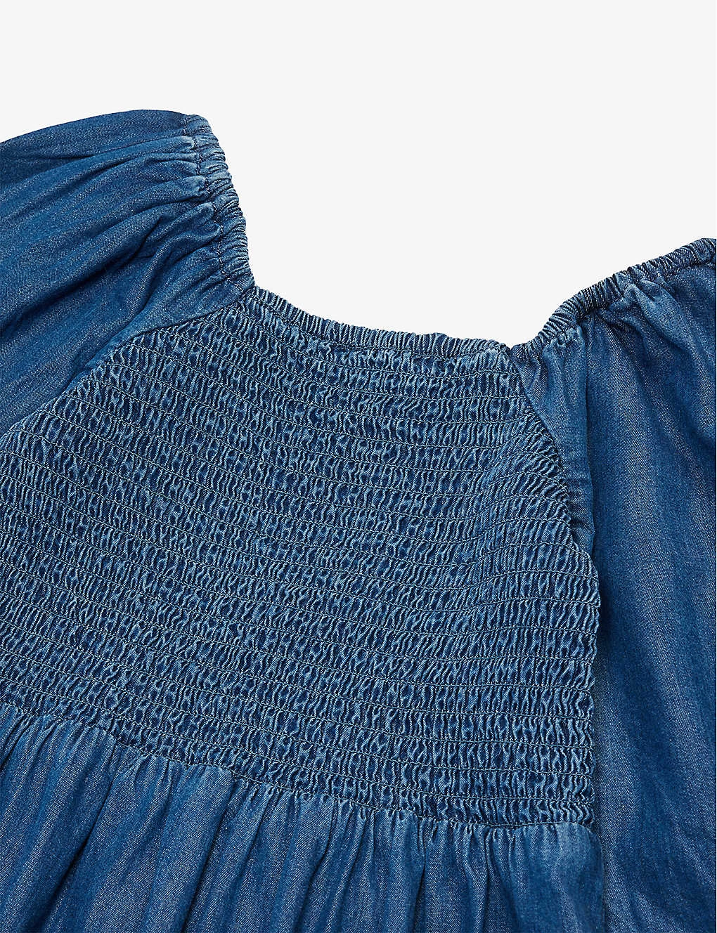 - Regular fit, square neck, off-the-shoulder three-quarter-length sleeves, smocked panel at bodice, pleated at waist, brand patch at side