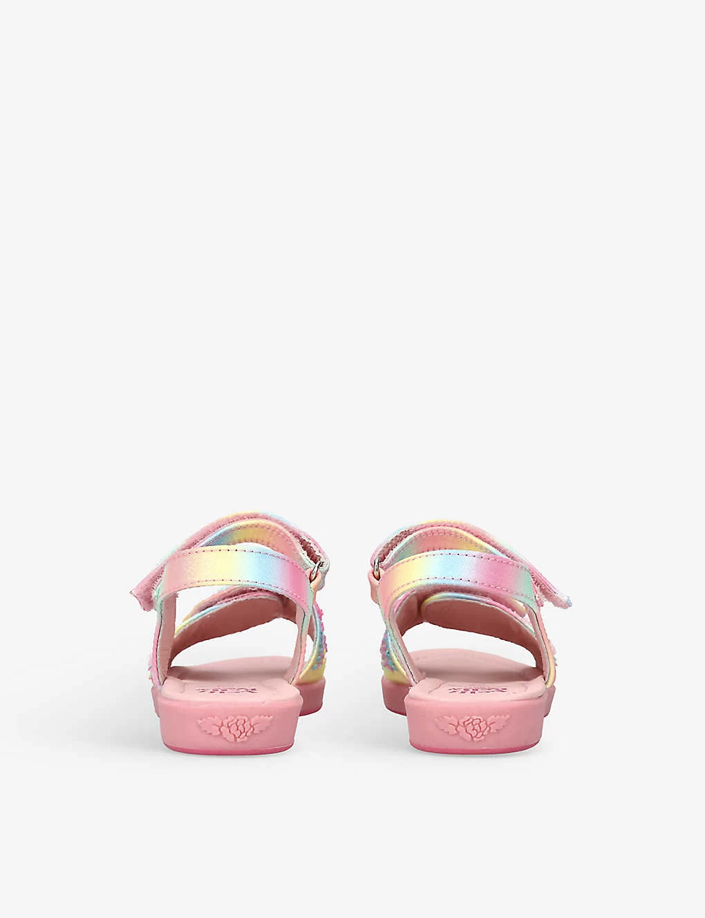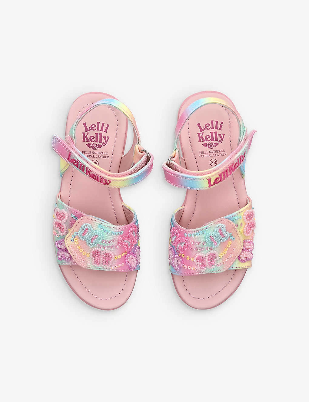 - Round open toe, adjustable straps, rainbow details, butterfly beading at upper, embossed branding at sole