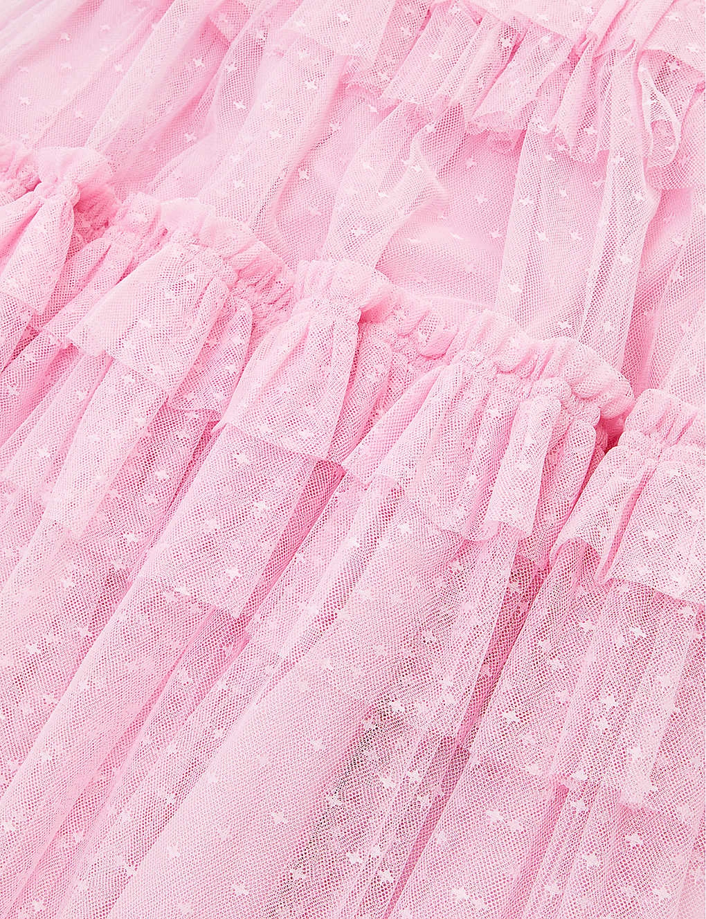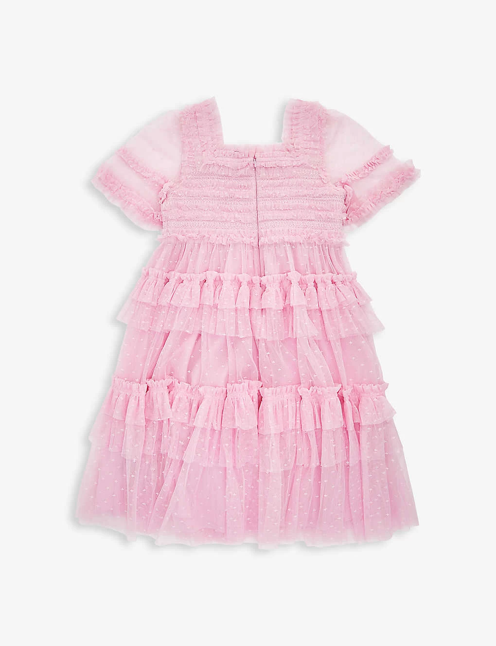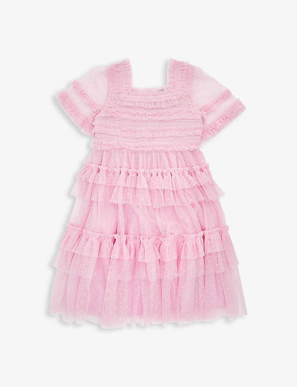 - Regular-fit, square neck, short sleeves, smocked bodice, all-over tiered ruffled panels, tulle skirt, fully lined