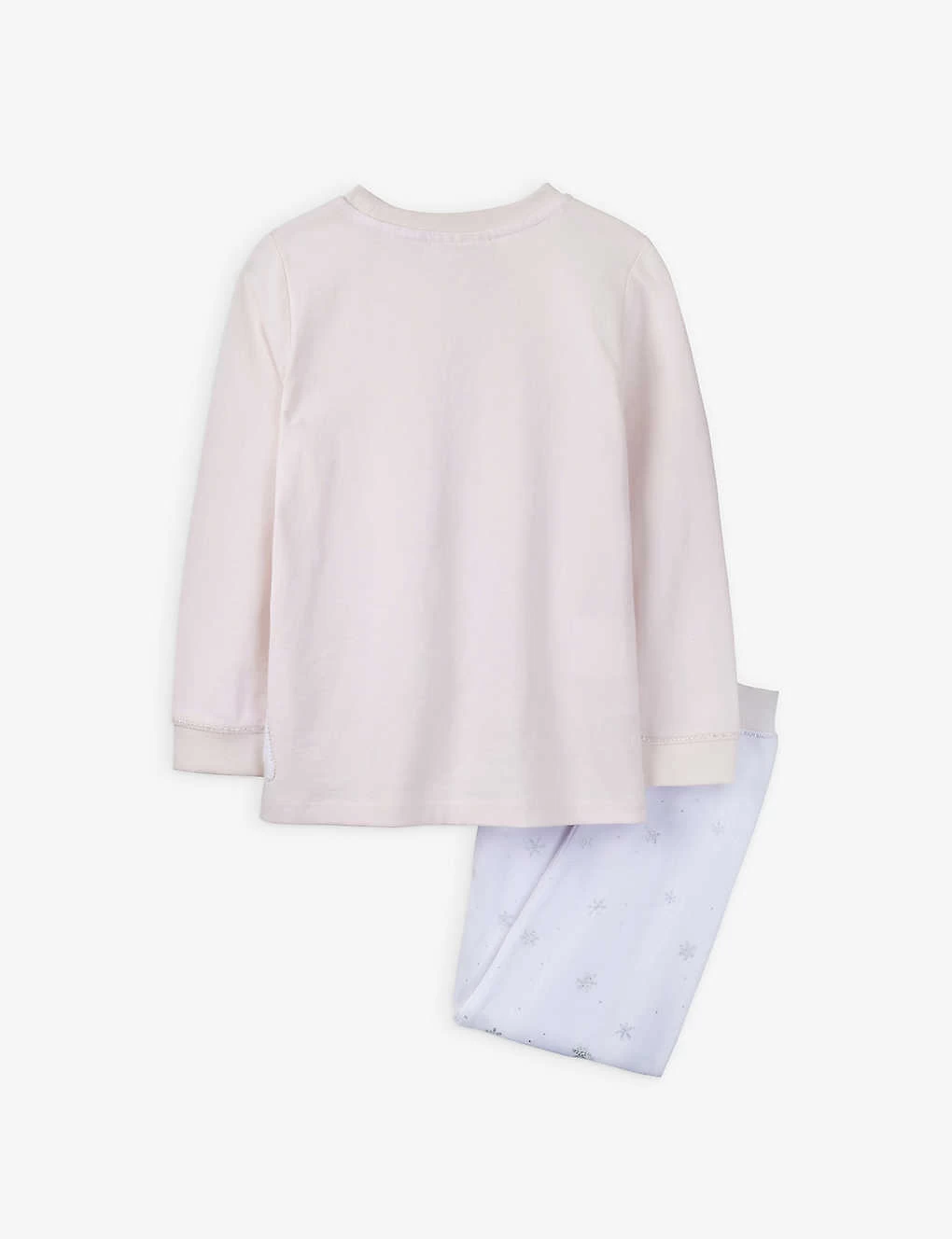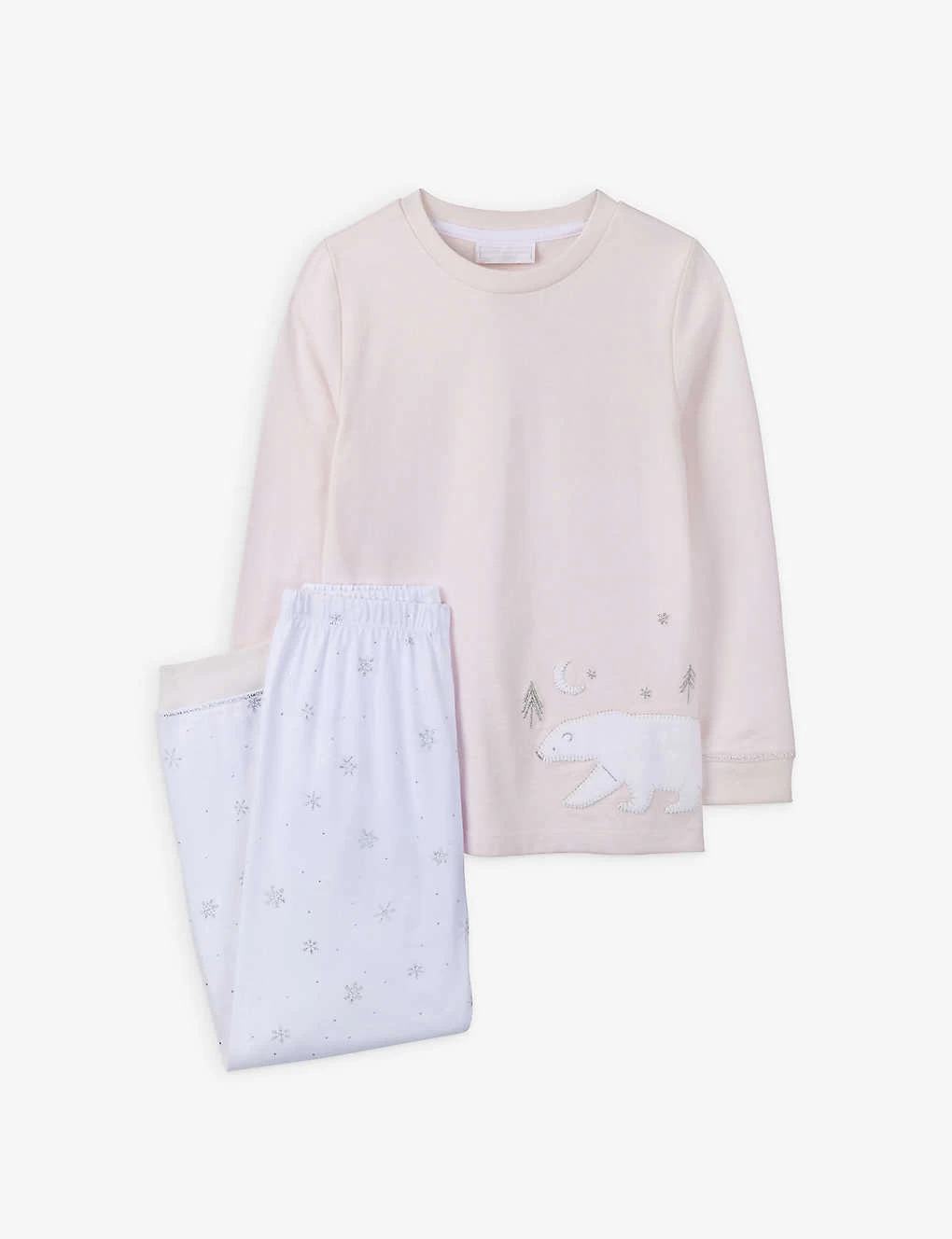 - Bottoms: regular fit, mid-rise, straight leg, elasticated waistband, all-over embroidered metallic snowflake and stars