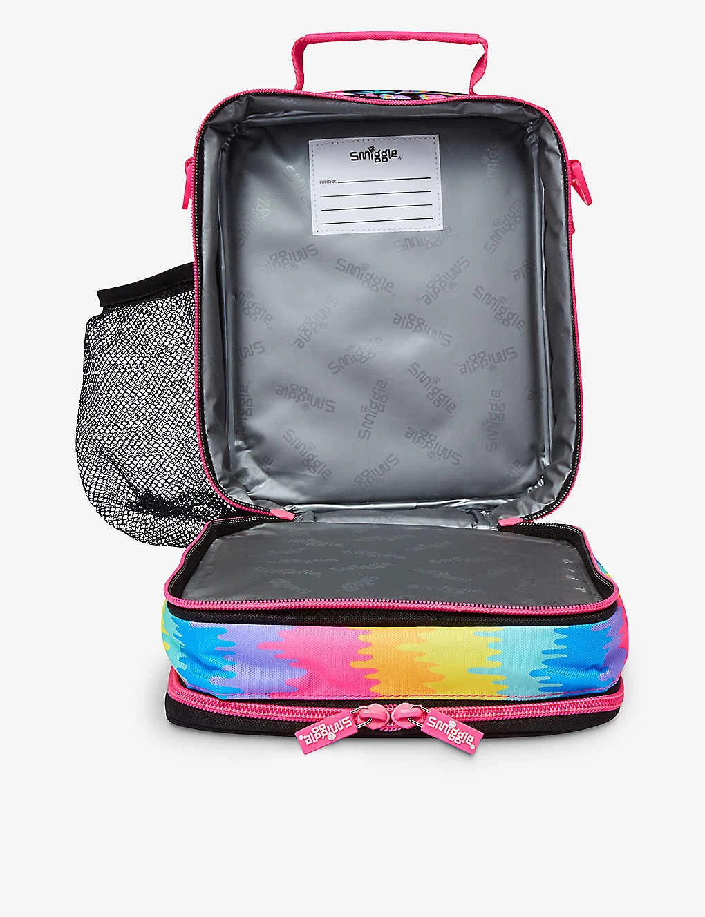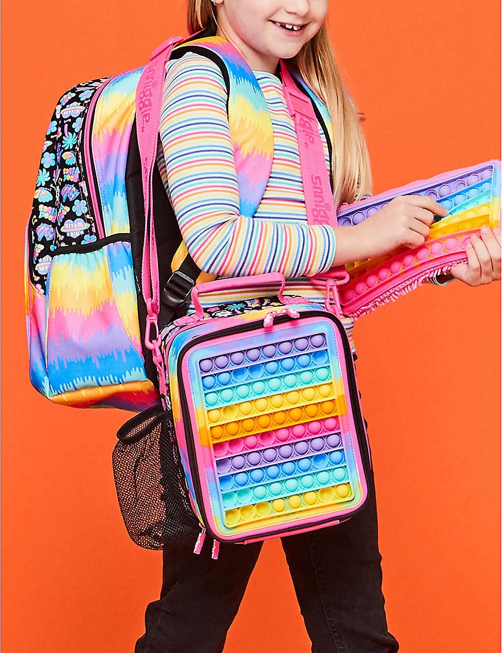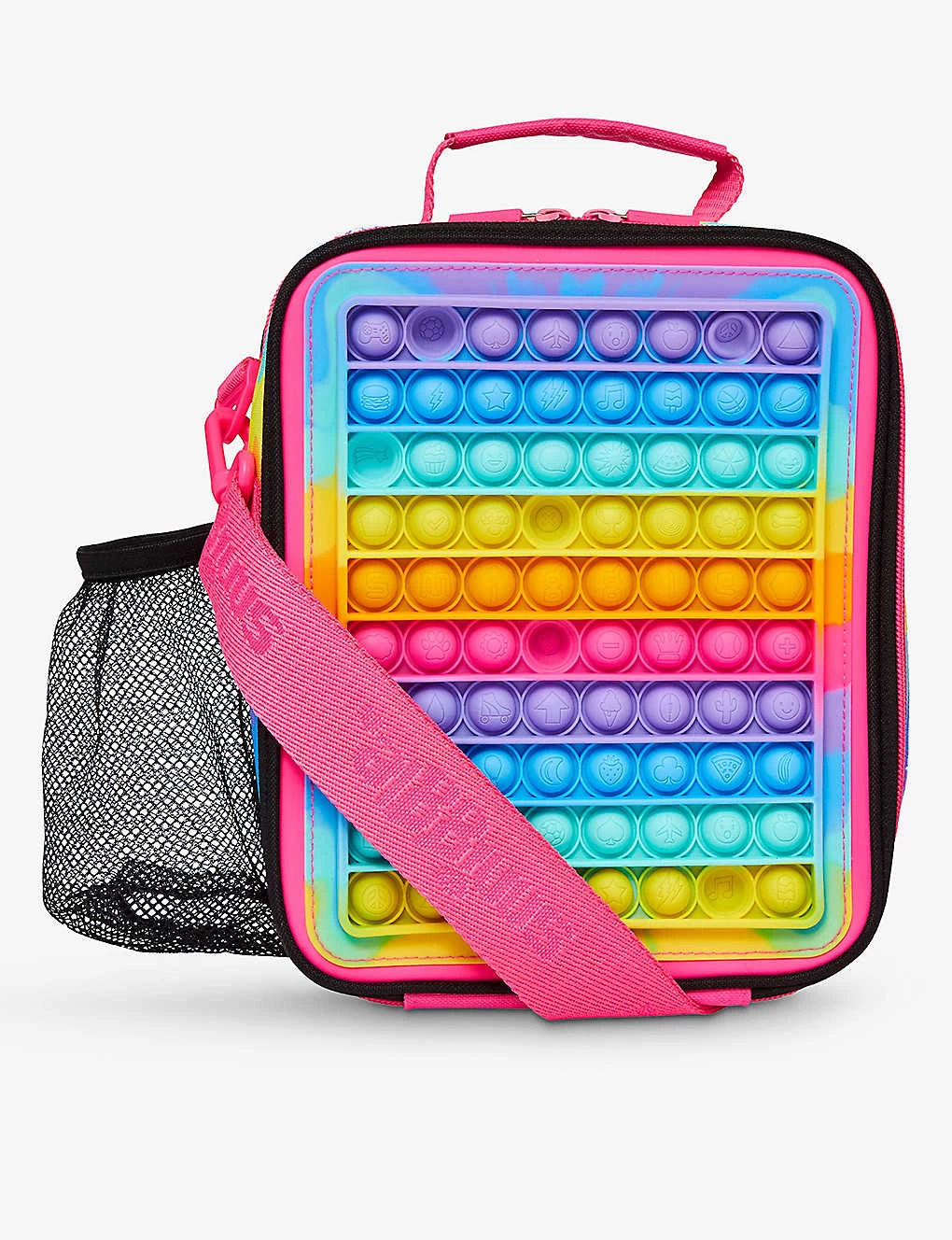 - Adjustable and removable shoulder strap, carry handle, food safe lining and food safe silicone panel, Insulated lining, two zipped compartments with double zips, sensory pop it panel, embossed logos, bottle sleeve, internal name label