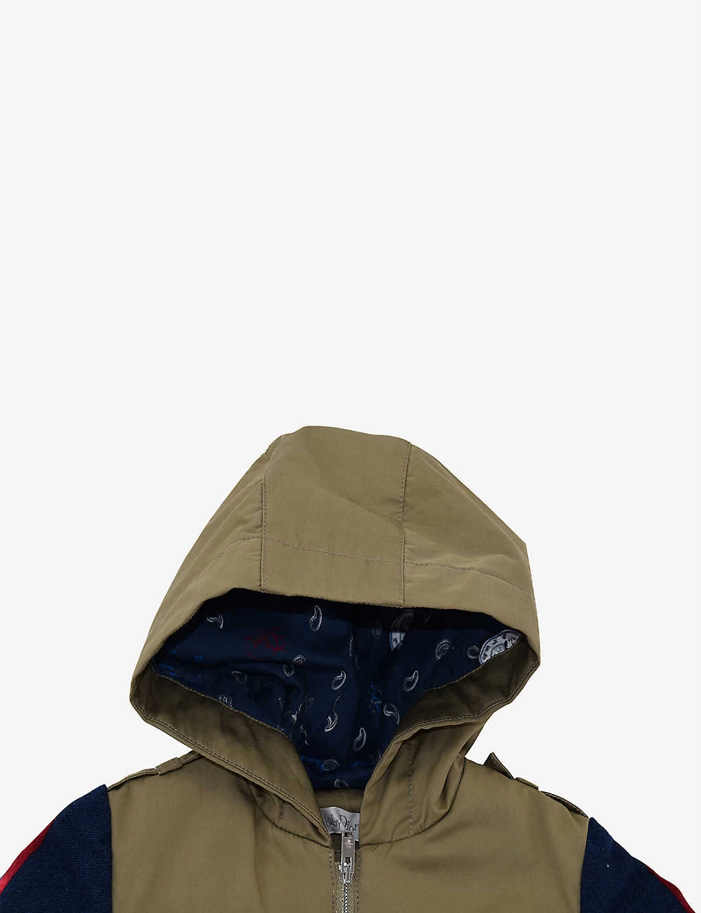 - Hooded, contrast sleeves, stripe detail on arms, four front pockets with flaps, clock patch on front