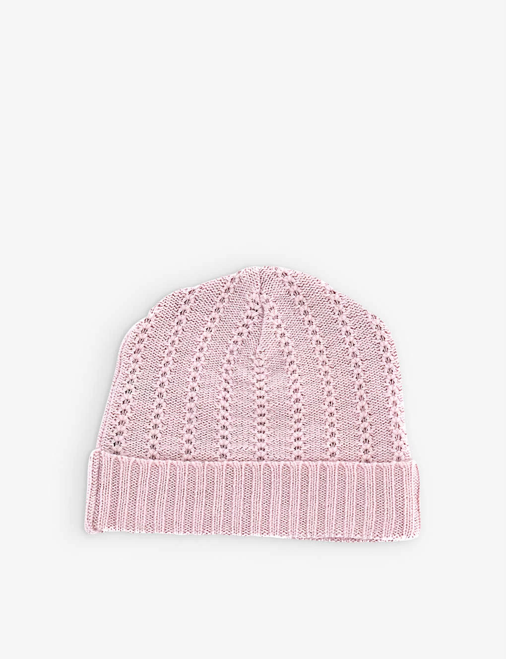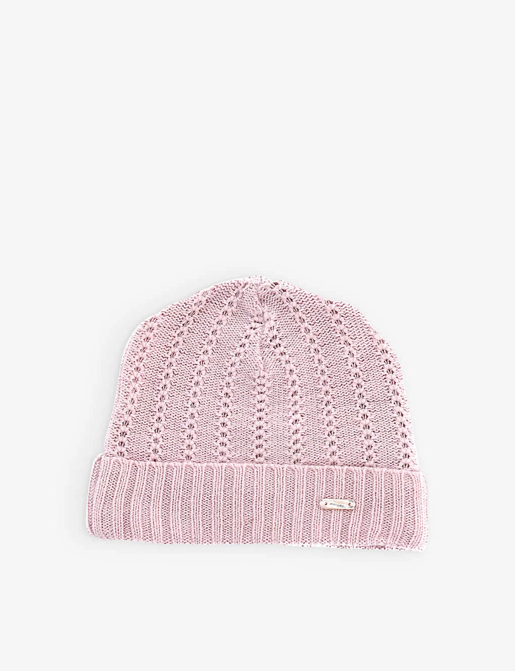 - Regular fit, all-over knit weave, folded brim, logo plaque on front