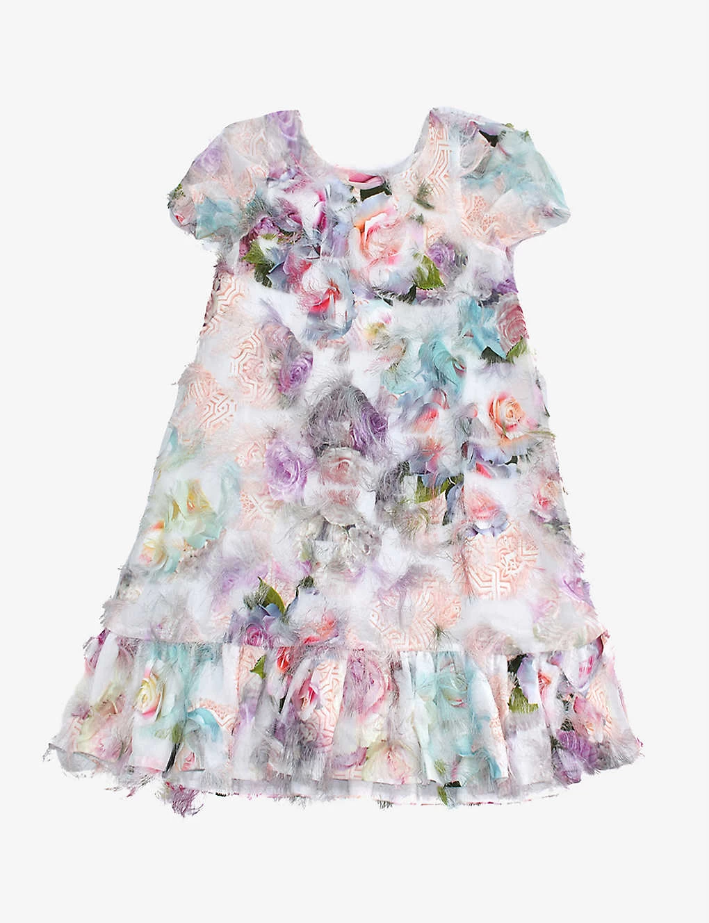 - Regular fit, A-line silhouette, sleeveless, tulle skirt, all-over floral print, gold-tone details