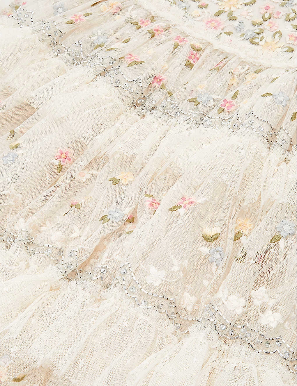 - Relaxed fit, A-line shape, round collar, sheer long sleeves, elasticated cuffs, high waist, all over flower embroidery and beads embellishment, all over mesh texture, frilled trims, ruffled skirt, fully lined