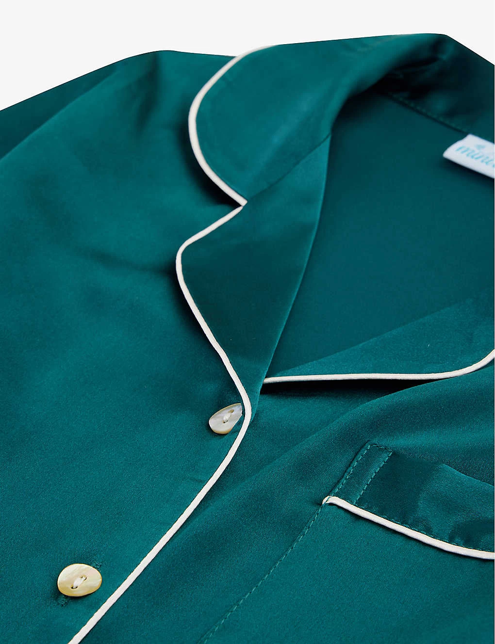 - Top: relaxed fit, V neck, camp collar, long sleeves, straight cuffs,patch pocket at front, contrast piping, all over satin texture, straight hem