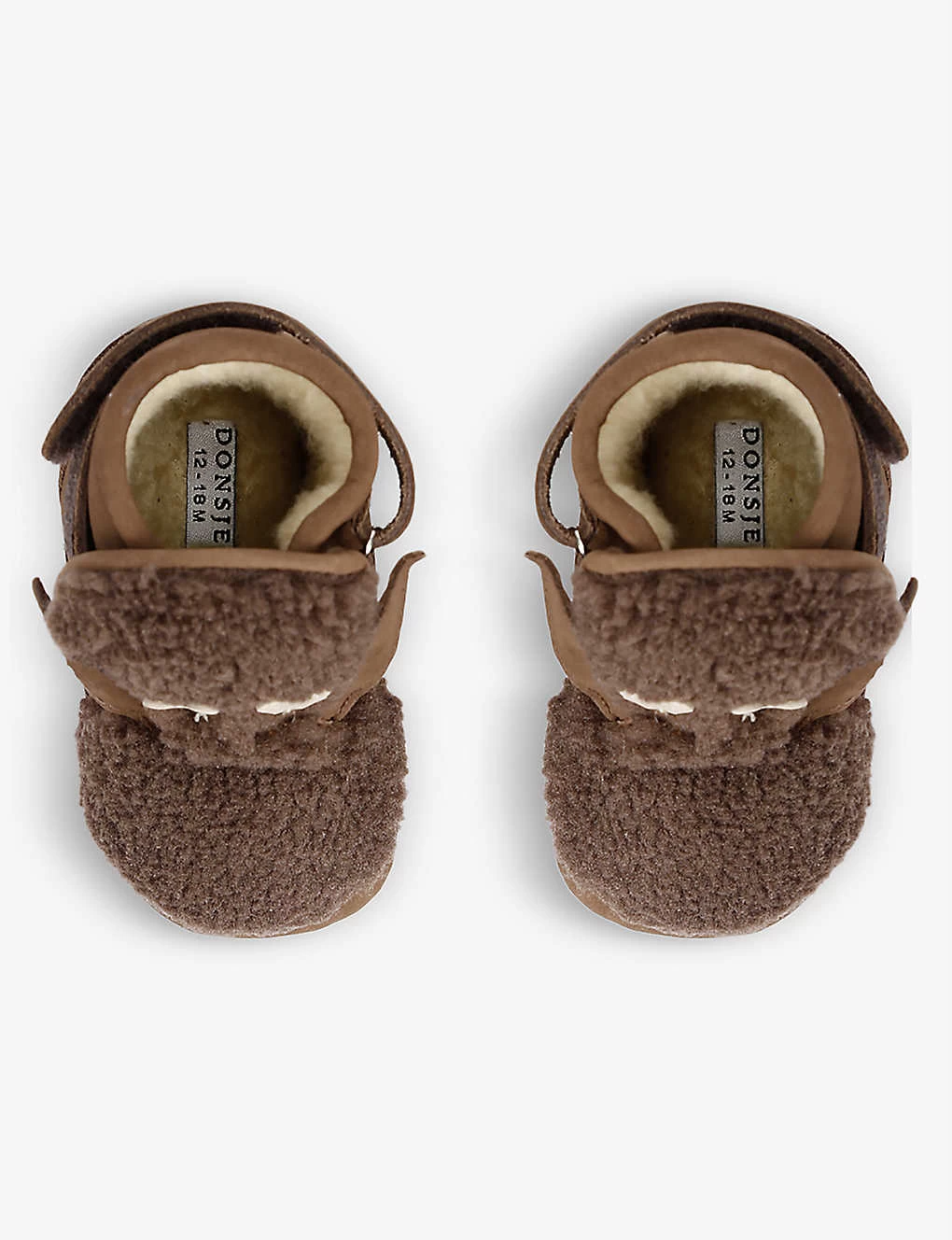 - Round toe, closed toe, animal detailing, logo embossed at side, shearling lining, ridged rubber sole, handmade