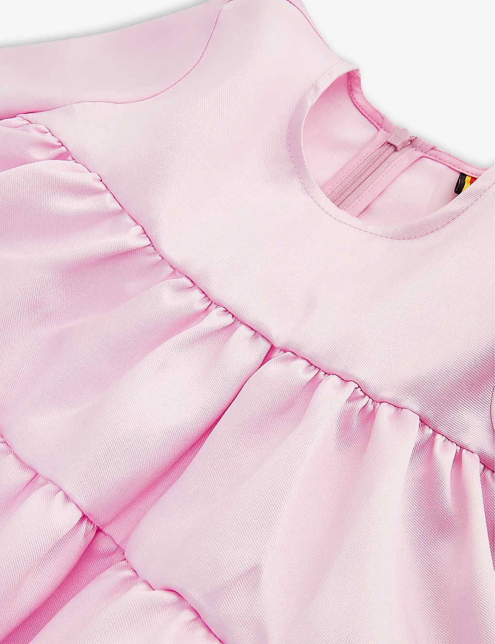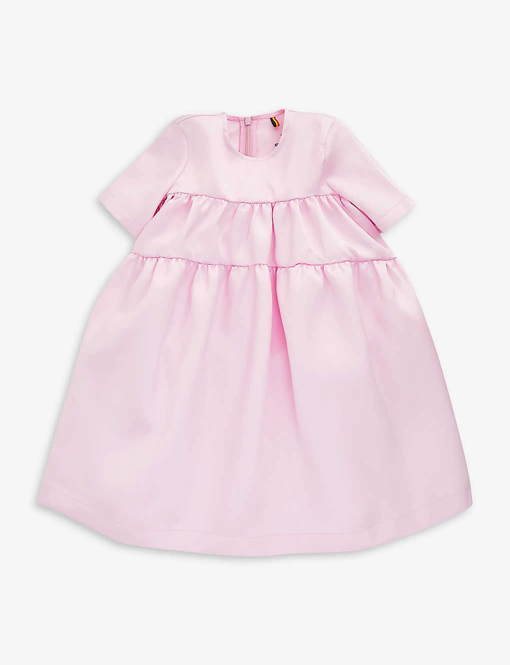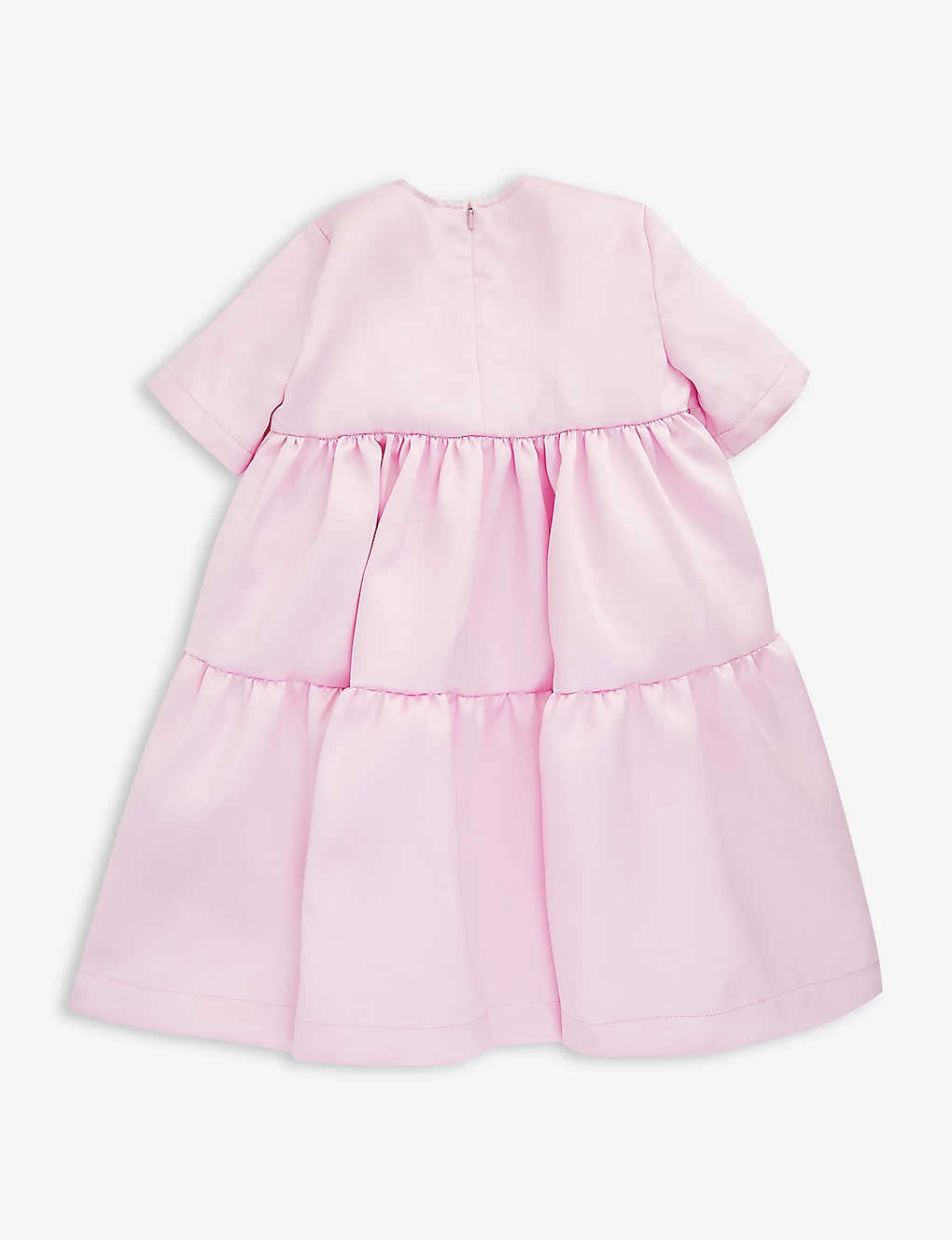- Tiered and flared silhouette, round neck, short sleeves, all-over pin-tucked pleats, satin finish