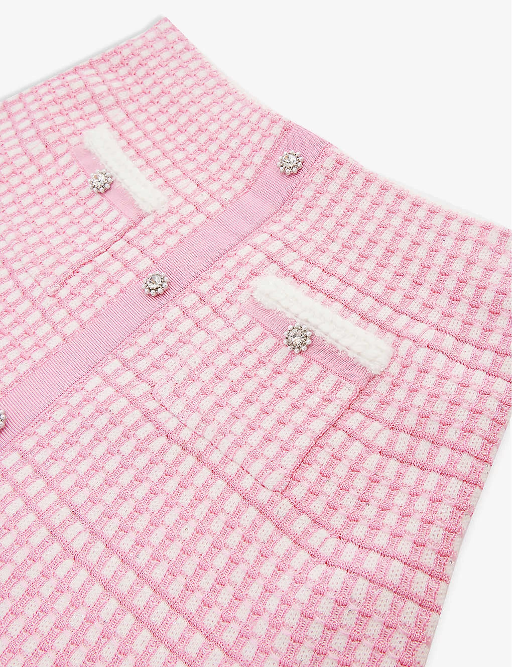 - Regular fit, elasticated waistband, two buttoned patch pockets at front, all-over grid knit pattern, fine knit texture, metallic thread weave, contrast trims, silver-toned embellished buttons