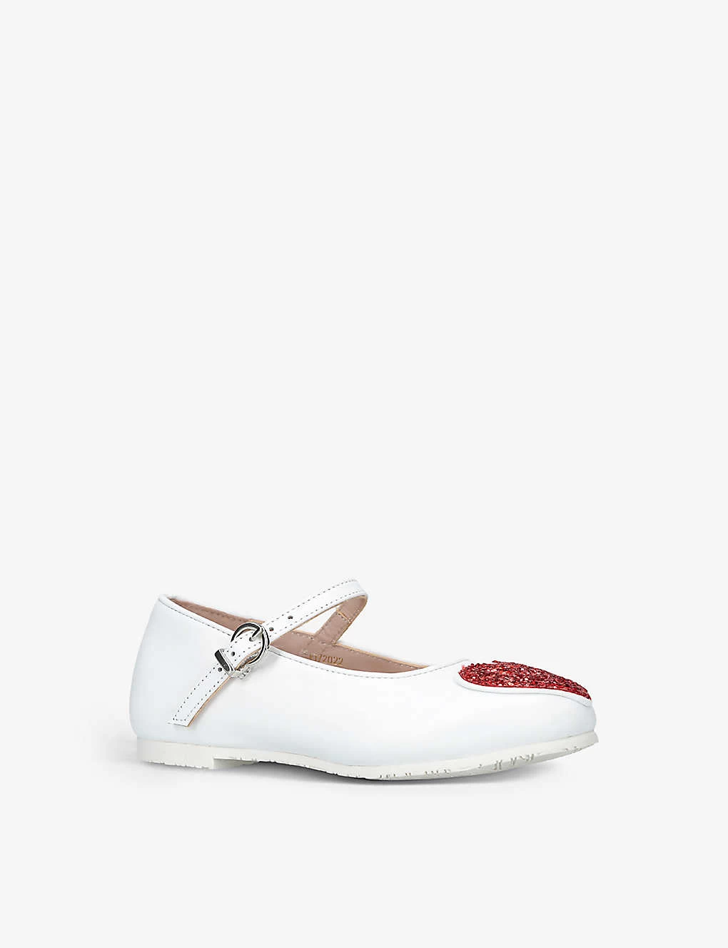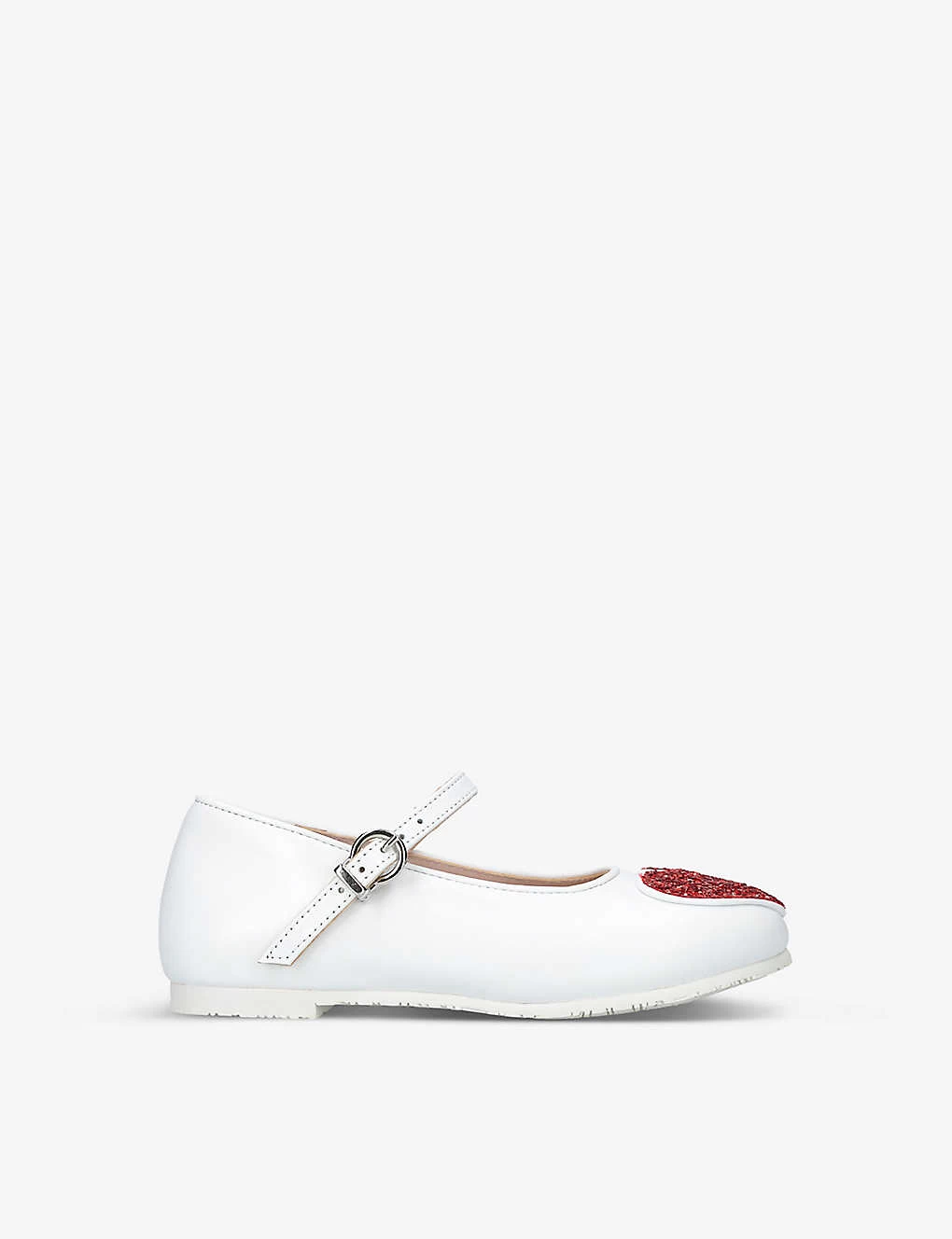 - Round closed toe, single adjustable buckle strap at front, glitter-embellished heart-motif at front