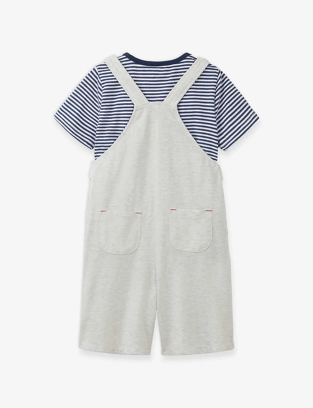 - T-shirt: round neck, short sleeves, stripe-print throughout, dungarees: button fastening, 1 pocket at the front, 2 slip pockets at the side, short silhouette